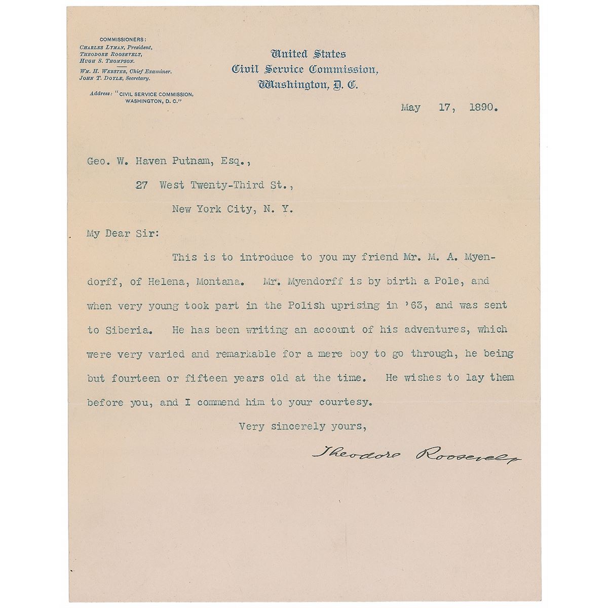 TLS, one page, 7.75 x 9.75, United States Civil Service Commission letterhead, May 17, 1890. Letter to publisher George Putnam. In full: “This is to introduce you to my friend Mr. M. A. Myendorff, of Helena, Montana. Mr. Myendorff is by birth a Pole, and when very young took part in the Polish uprising in ’63, and was sent to Siberia. He has been writing an account of his adventures, which were very varied and remarkable for a mere boy to go through, he being but fourteen or fifteen years old at the time. He wishes to lay them before you, and I commend him to your courtesy.” In fine condition. Accompanied by an unsigned engraving of Roosevelt.