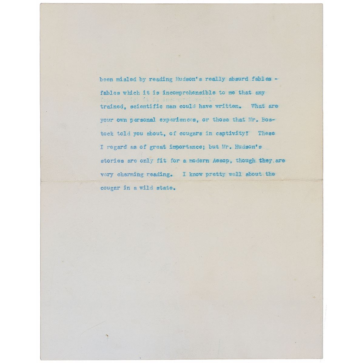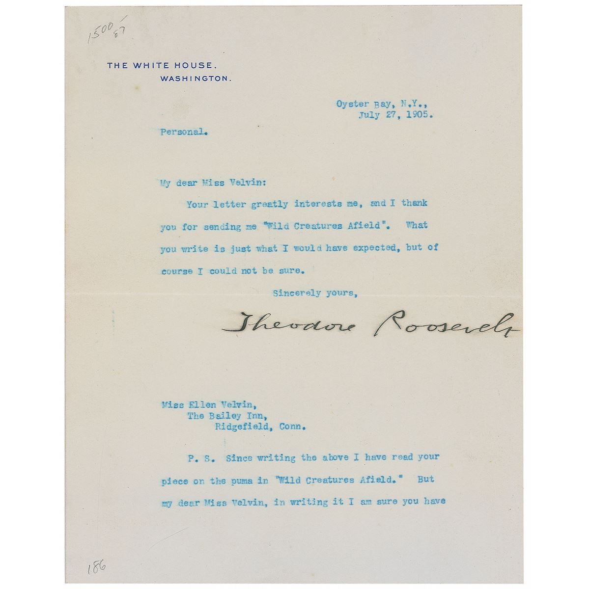 TLS as president, two pages on two adjoining sheets, 7 x 8.75, White House letterhead, July 27, 1905. Letter to Ellen Velvin. In part: “I have read your piece on the puma in ‘Wild Creatures Afield.’ But my dear Miss Velvin, in writing it I am sure you have been misled by reading Hudson’s really absurd fables—fables which it is incomprehensible to me that any trained, scientific man would have written. What are your own personal experiences, or those that Mr. Bostock told you about, of cougars in captivity? These I regard as of great importance; but Mr. Hudson’s stories are fit for a modern Aesop, though they are very charming reading. I know very well about the cougar in a wild state.” In fine condition, with light soiling and faint feathering to ink. One of Roosevelt’s famed hunting exploits came in Colorado in 1901, when, helped by his hunting dogs, he killed a cougar with a knife. Wonderful content revealing Roosevelt’s passion for big game.