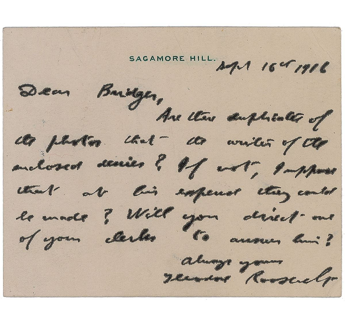 ALS, one page, 4.5 x 3.5, Sagamore Hill letterhead, September 16, 1916. Letter to “Bridger,” possibly Harry St. John Bridger, the British explorer and author, in full: “Are there duplicates of the photos that the writer enclosed desires? If not, I suppose that at his expense they could be made? Will you direct one of your clerks to answer him?” Letter has been neatly and removably encapsulated. Light overall feathering of ink to text and signature, a small crease to upper right corner, and trivial mounting remnants to reverse, otherwise fine condition.