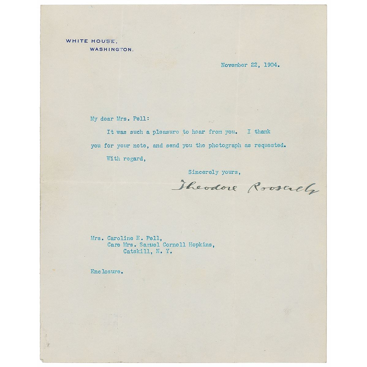 TLS as president, one page, 7 x 8.75, White House letterhead, November 22, 1904. Letter to Caroline Pell, in full: “It was such a pleasure to hear from you. I thank you for your note, and send you the photograph as requested.” In fine condition, with intersecting folds (passing through portions of the signature) and trivial creasing.