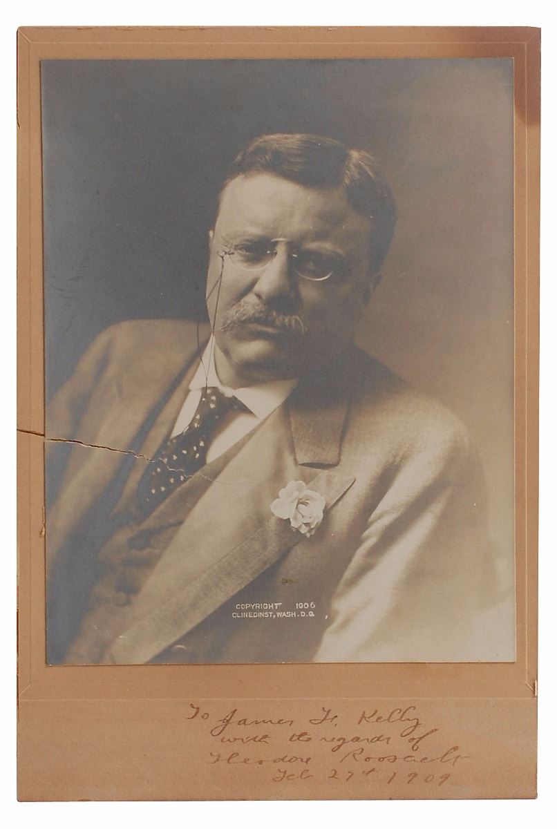 Handsome matte-finish 6.25 x 8.25 portrait of Roosevelt, affixed to its original 7 x 10.5 mount, signed and inscribed on the mount in ink as president, “To James F. Kelly, with the regards of Theodore Roosevelt, Feb 27th 1909.” In very good condition, with a large crack passing from the left edge of the mount into the lapel area of the photo, stain to upper right corner, and trimmed edges. Roosevelt left the White House just one week later on March 4.