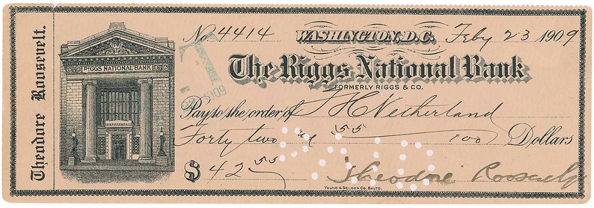 Personal check, 8.25 x 2.75, filled out in another hand and signed by Roosevelt as president, payable to T. H. Netherland for $42.55, February 23, 1909. In very good condition, with slight creasing, expected bank stamps, cancellation cuts and holes (affecting a few letters of the signature), and light brushing to his first name. Thomas H. Netherland served as a clerk in the White House, whose main responsibility was issuing social invitations. On May 12, 1909, Netherland shot himself in a fit of depression due to a nervous breakdown resultant from overwork in the closing days of his White House service.