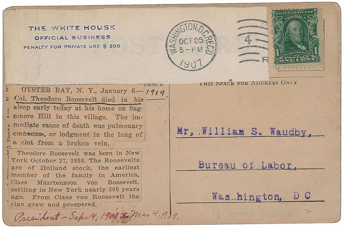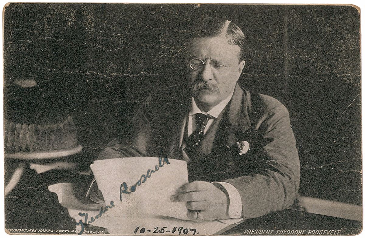 Desirable 5.5 x 3.5 postcard photo of President Roosevelt poring over papers at his desk, signed in black ink. A slip clipped from the original White House mailing envelope is affixed to the reverse and bears a 1907 postmark. In very good condition, with overall creases, light rubbing, and feathering to ink.