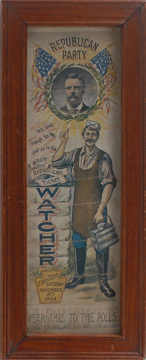 Republican Party color campaign ‘poll watcher’ ad from the 1904 presidential election, 3.5 x 9, depicting President Theodore Roosevelt and an illustration of a working class supporter, reading: “He’s good enough for me and so is the whole Republican ticket.” Text along the bottom reads, “Wear this to the polls.” Framed to an overall size of 4.5 x 11.5. Restored to very good condition, with numerous repaired horizontal tears.