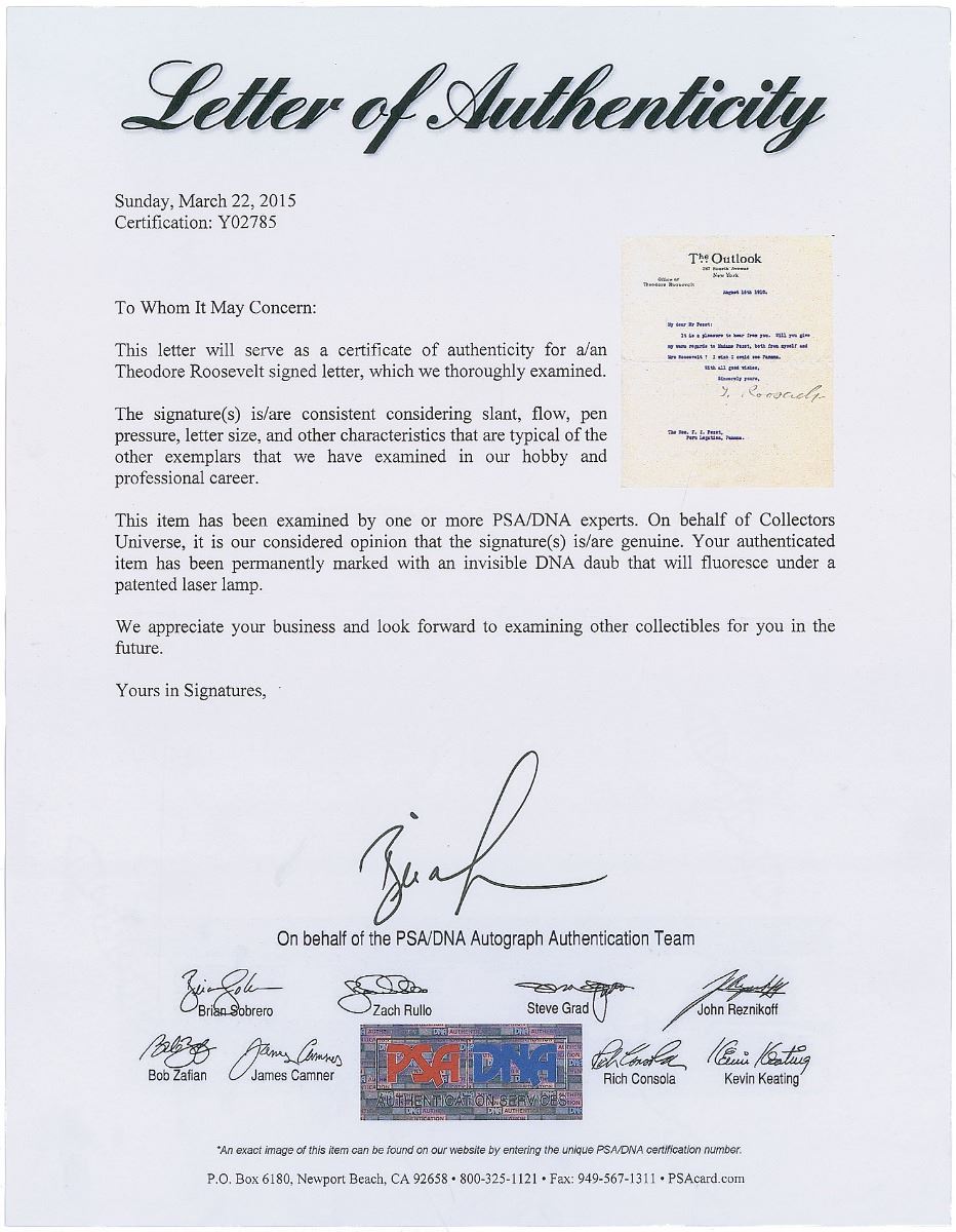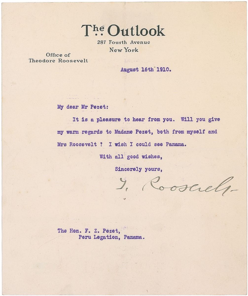 TLS signed “T. Roosevelt,” one page, 6.5 x 7.75, The Outlook letterhead, August 16, 1910. Letter to F. Z. Pezet of the Peru Legation, in full: “It is a pleasure to hear from you. Will you give my warm regards to Madame Pezet, both from myself and Mrs. Roosevelt! I wish I could see Panama.” In fine condition, with central vertical and horizontal folds (vertical fold passing through his initial) and trivial soiling. Accompanied by a full letter of authenticity from PSA/DNA.