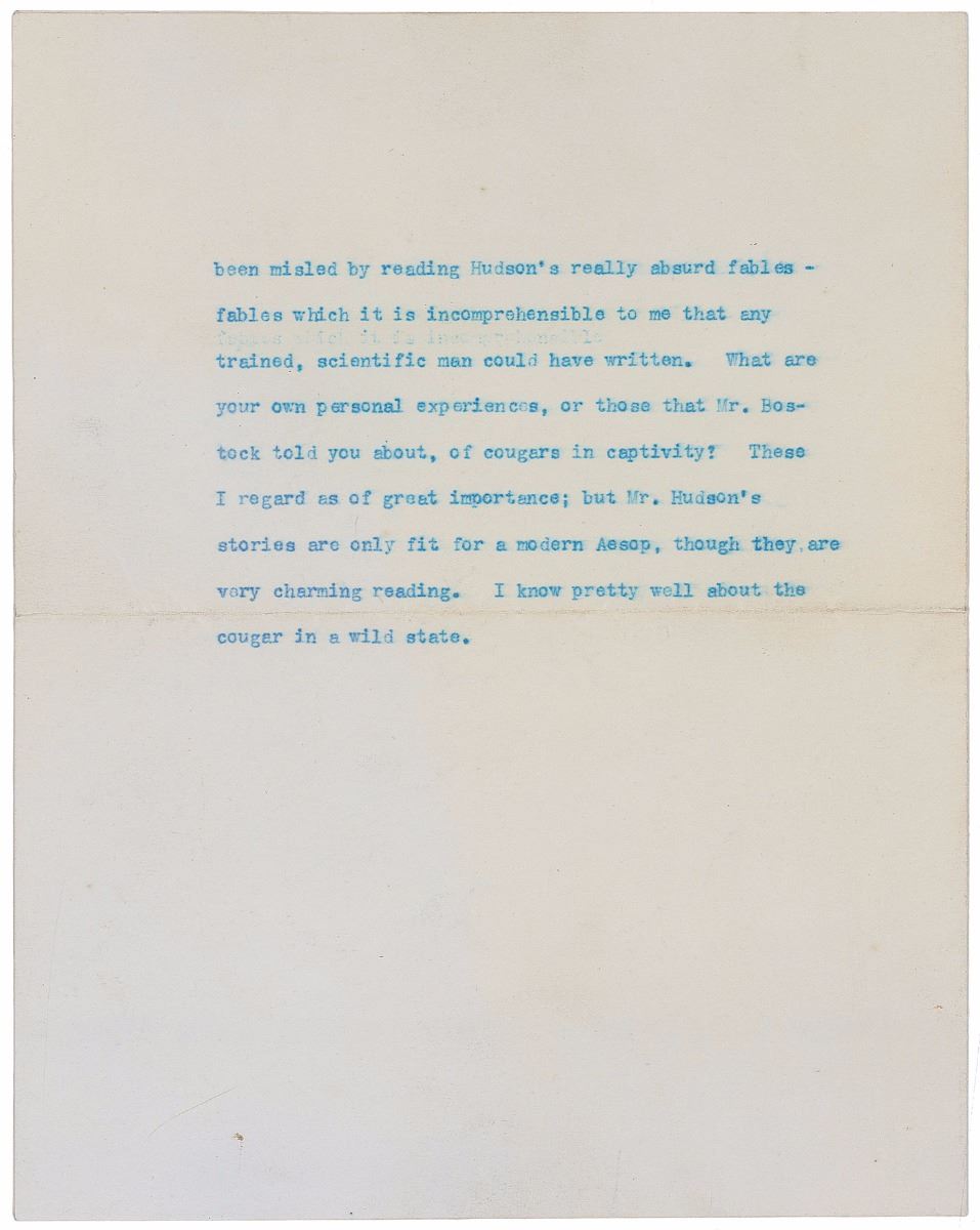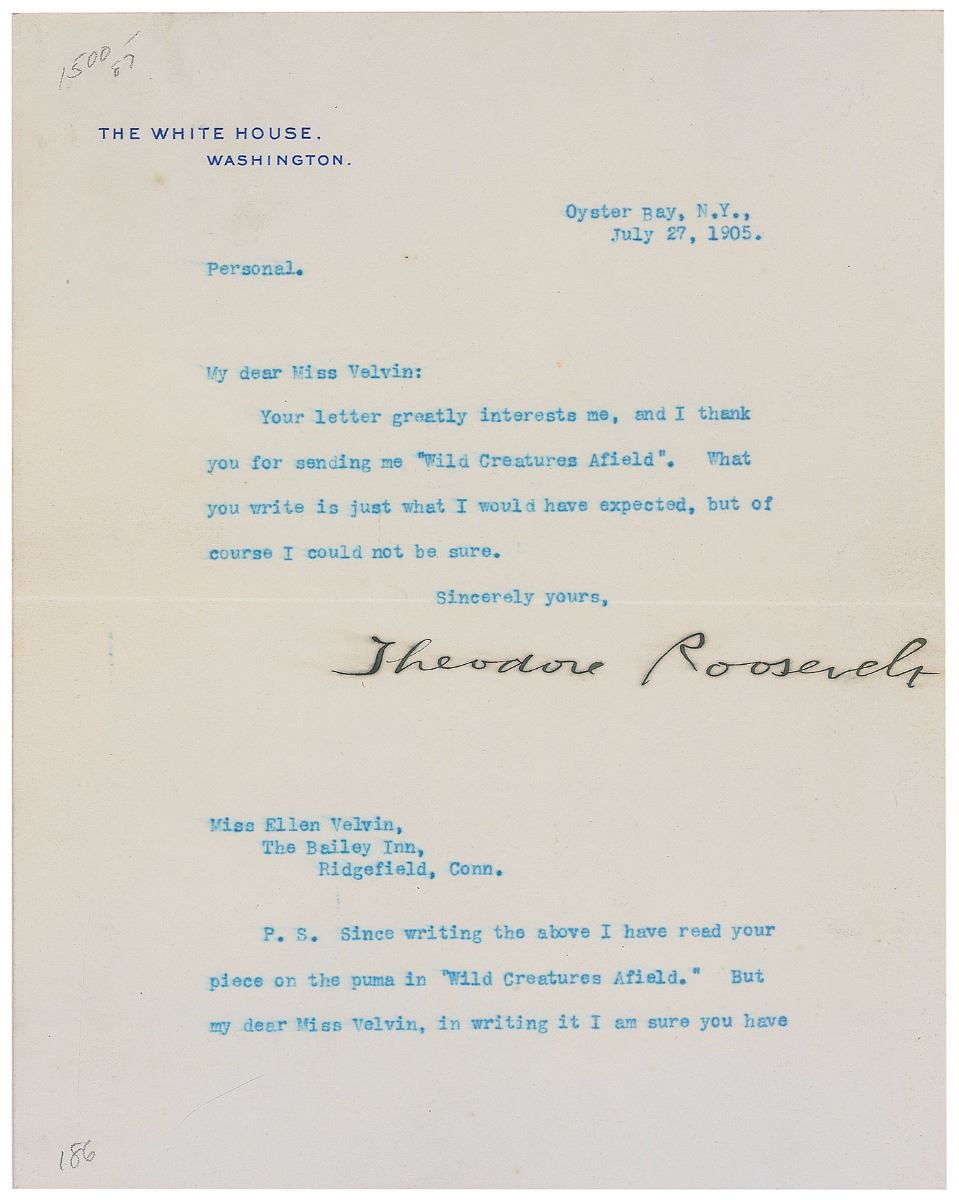 TLS as president, two pages on two adjoining sheets, 7 x 8.75, White House letterhead, July 27, 1905. Letter to Ellen Velvin. In part: “I have read your piece on the puma in ‘Wild Creatures Afield.’ But my dear Miss Velvin, in writing it I am sure you have been misled by reading Hudson’s really absurd fables—fables which it is incomprehensible to me that any trained, scientific man would have written. What are your own personal experiences, or those that Mr. Bostock told you about, of cougars in captivity? These I regard as of great importance; but Mr. Hudson’s stories are fit for a modern Aesop, though they are very charming reading. I know very well about the cougar in a wild state.” In fine condition, with light soiling and faint feathering to ink. One of Roosevelt’s famed hunting exploits came in Colorado in 1901, when, helped by his hunting dogs, he killed a cougar with a knife. Wonderful content revealing Roosevelt’s passion for big game.