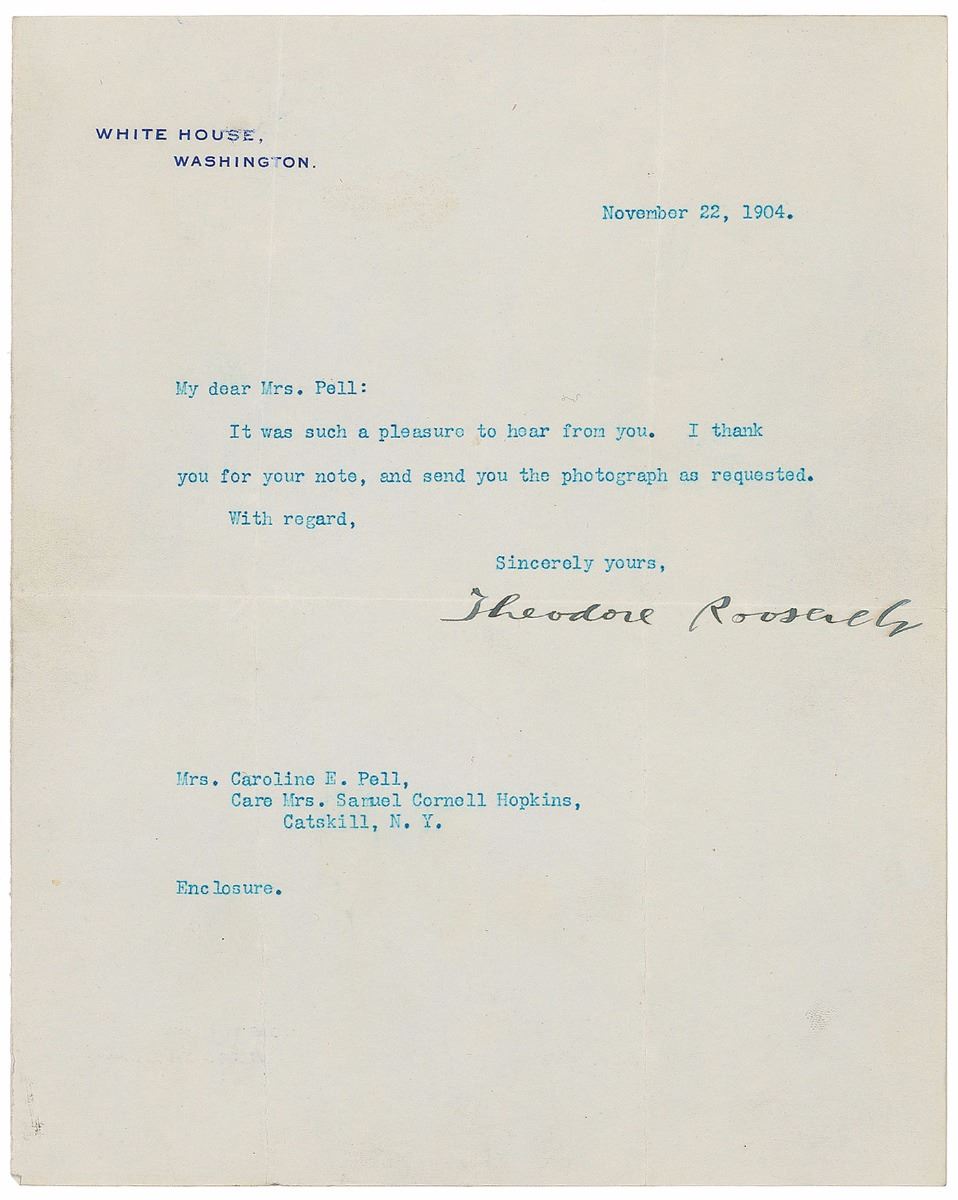 TLS as president, one page, 7 x 8.75, White House letterhead, November 22, 1904. Letter to Caroline Pell, in full: “It was such a pleasure to hear from you. I thank you for your note, and send you the photograph as requested.” In fine condition, with intersecting folds (passing through portions of the signature) and trivial creasing.