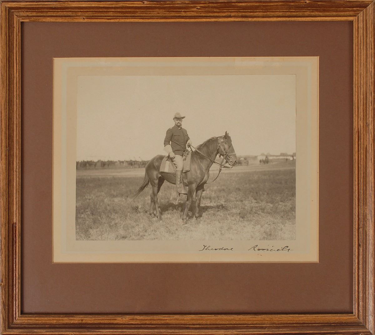 Exceptional 8 x 6 albumen photo of Roosevelt on horseback in his Rough Riders uniform, affixed to a 9.5 x 7.5. mount, boldly signed on the mount in black ink. Attractively matted and framed. In fine condition. While signed portraits of Roosevelt in his Rough Riders uniform are not extremely scarce, they are typically more posed, formal shots; rarely is he seen actually atop a horse. A superior early example.