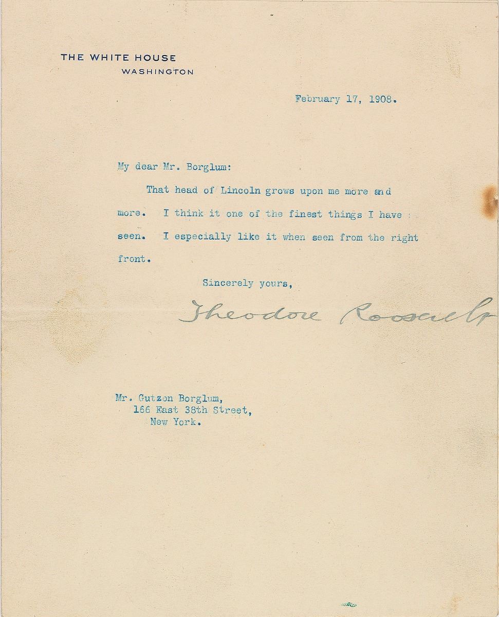 TLS as president, one page, 7 x 8.75, White House letterhead, February 17, 1908. Letter to Gutzon Borglum, the sculptor of Mount Rushmore. In full: “The head of Lincoln grows upon me more and more. I think it one of the finest things I have seen. I especially like it when seen from the right front.” In fine condition, with a light spot of soiling along the central horizontal fold, and a small singe mark to the right edge. Long before beginning his work on Mount Rushmore, Borglum carved a massive marble bust of Abraham Lincoln in 1908 that was exhibited in Theodore Roosevelt's White House. Robert Todd Lincoln praised it as perhaps the greatest likeness of his father he had ever seen, and the bust was donated to the Congress later that year. Interestingly, when designing Mount Rushmore in the 1920s, Borglum placed President Roosevelt next to Lincoln. An excellent association piece with superb content.