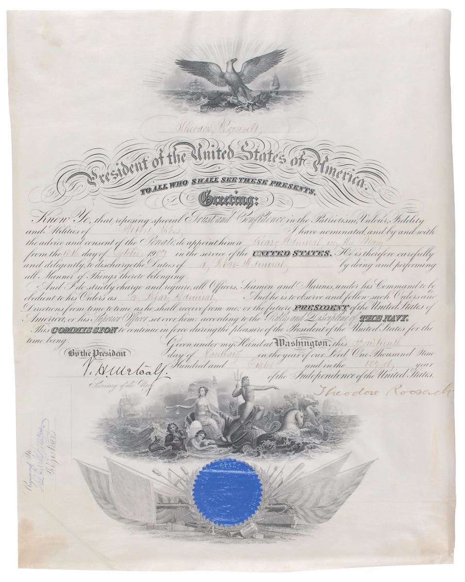 Small archive related to the founding of the US Naval Training Station, highlighted by a vellum partly-printed DS, signed as president, “Theodore Roosevelt,” one page, 14.25 x 18, January 14, 1908, appointing Albert Ross as “a Rear-Admiral in the Navy.” Signed at the conclusion by President Roosevelt, and countersigned by Secretary of the Navy Victor H. Metcalf. The blue seal affixed near the bottom remains fully intact. Also includes six 7 x 5 glass negatives of the 1906 approved blueprints for the US Naval Training Station in Great Lakes, Illinois, for which Ross was responsible. Additionally accompanied by a few period photos of Ross and later postcards depicting the station. In overall fine condition, with some scattered staining to edges of the document. The Great Lakes Naval Training Station project was approved by President Roosevelt in 1904, with a view to constructing the first naval training station in America. He made Ross the first commander and charged him with supervising the construction of the base, which remains the US Navy’s only boot camp and has grown to include well over a thousand buildings. It was not until after Roosevelt’s presidency that the facility became operational, opening its doors on July 1, 1911. An appealing group with interesting military significance.