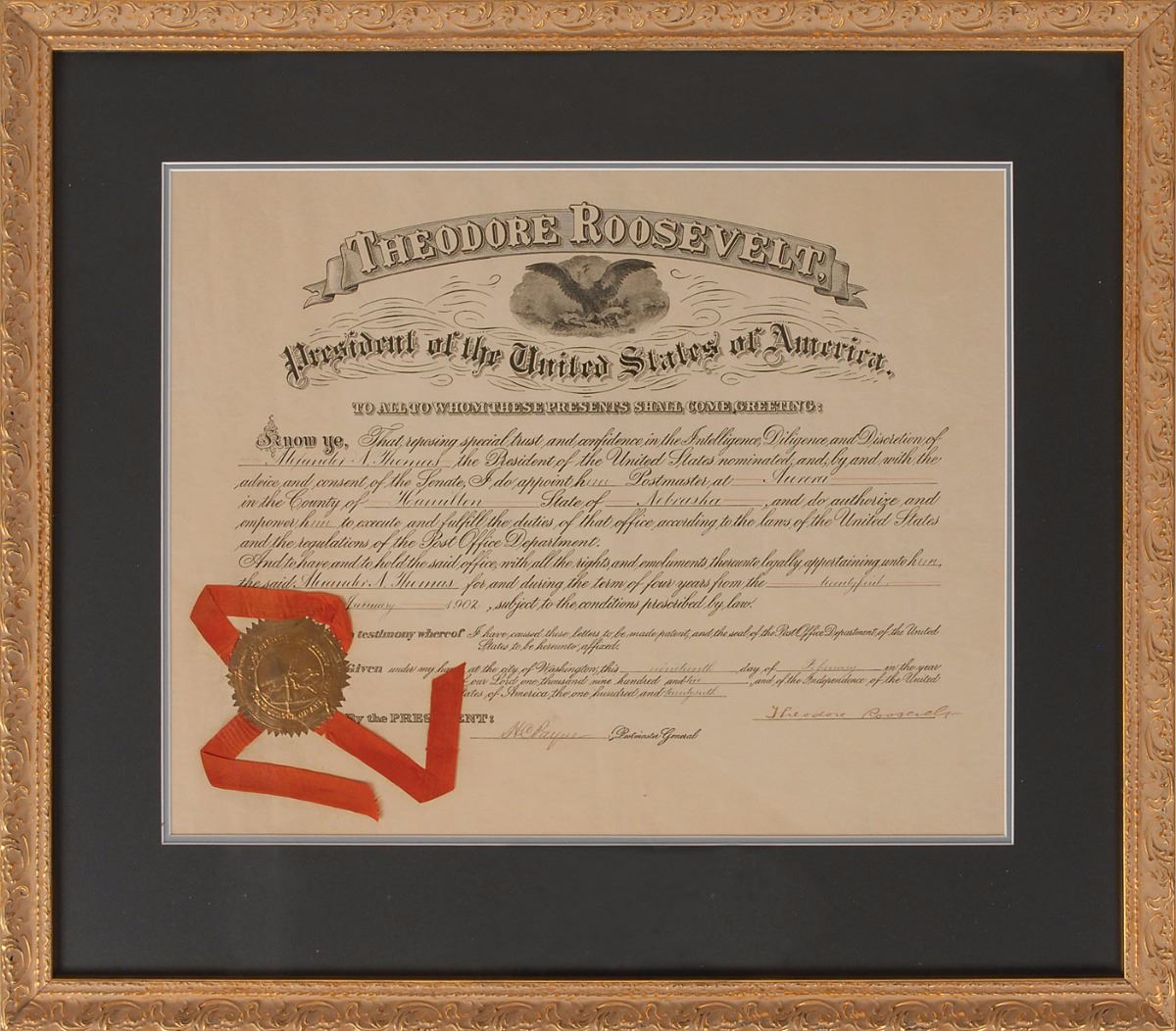 Partly-printed DS as president, one page, 17.25 x 13.75, February 19, 1902. President Roosevelt appoints Alexander N. Thomas as “Postmaster at Aurora, in the County of Hamilton, State of Nebraska.” Signed at the conclusion by Roosevelt and countersigned by Postmaster General Henry Clay Payne. The gold seal and red ribbon affixed to the lower left remain intact. Handsomely double-matted and framed. In fine condition. Oversized.