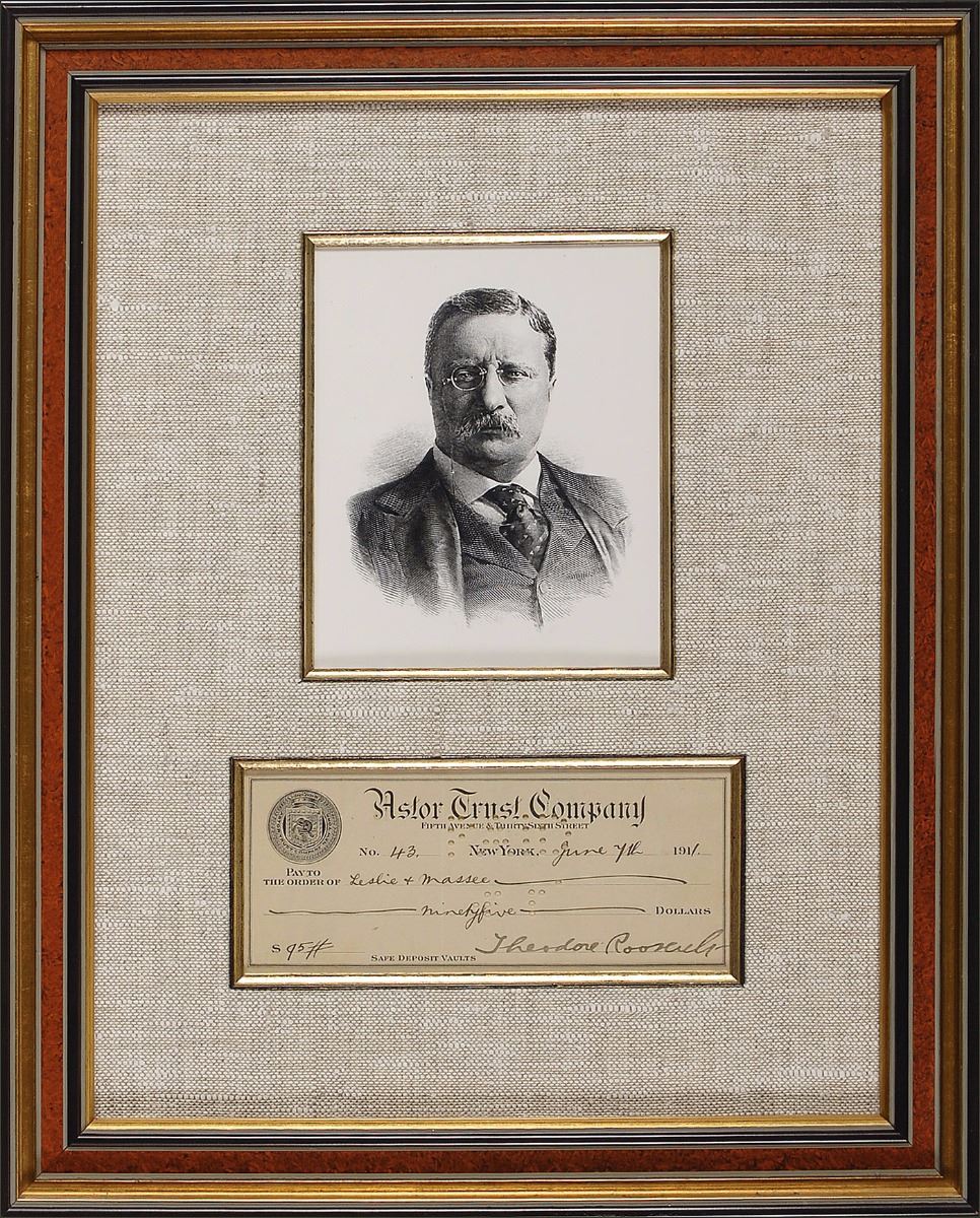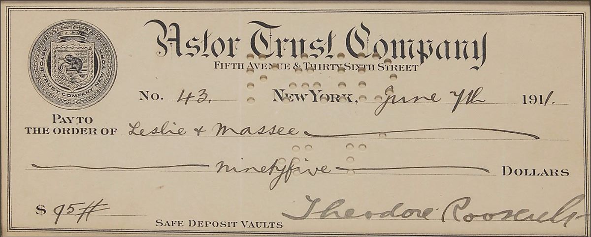 Astor Trust Company bank check, 6.5 x 2.75, filled out in another hand and signed by Roosevelt, payable to Leslie & Massee for $95, June 7, 1911. Cloth-matted and framed with a modern-era engraving. In fine condition, with two vertical folds. A nicely preserved check from the former chief executive, signed a few months before his announced 1912 presidential election bid and the formation of the Bull Moose Party.