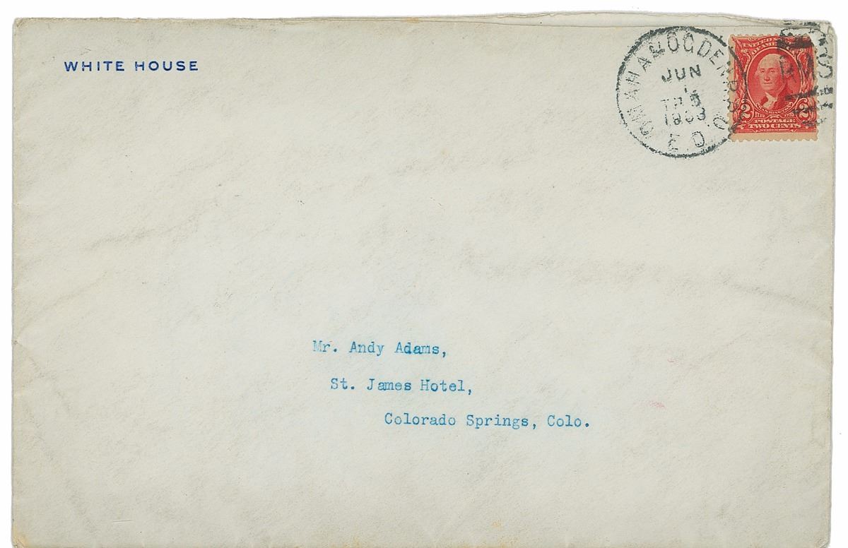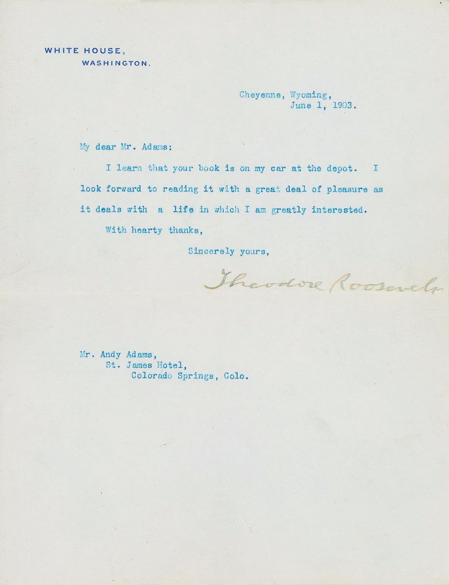 TLS as president, one page, 7 x 9.25, White House letterhead, June 1, 1903. Letter to author Andy Adams, written from Cheyenne, Wyoming. In full: “I learn that your book is on my car at the depot. I look forward to reading it with a great deal of pleasure as it deals with a life in which I am greatly interested.” In fine condition, with the signature a shade light. Accompanied by the original mailing envelope. Roosevelt was in Wyoming as part of a whirlwind tour through the American West, during which he visited twenty-five states and gave over 250 speeches. Included on the journey were visits to Yosemite with John Muir and Yellowstone with John Burroughs. He was in Cheyenne to give an address at the University of Wyoming. The book he refers to in this letter is most likely The Log of a Cowboy, which Adams published in 1903.