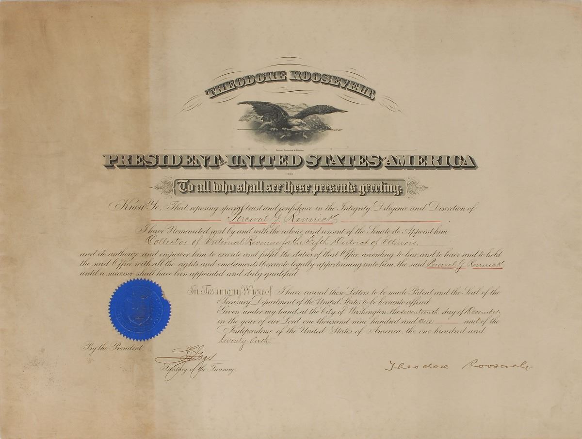 Partly-printed DS as president, one page, 21 x 16, December 17, 1901. President Roosevelt appoints Percival G. Remick as “Collector of Internal Revenue for the Fifth District of Illinois.” Nicely signed at the conclusion by President Roosevelt and countersigned by Secretary of the Treasury Lyman J. Gage. The blue seal affixed to the lower left remains intact. In very good to fine condition, with light soiling, and a block of toning over the left third of the document.