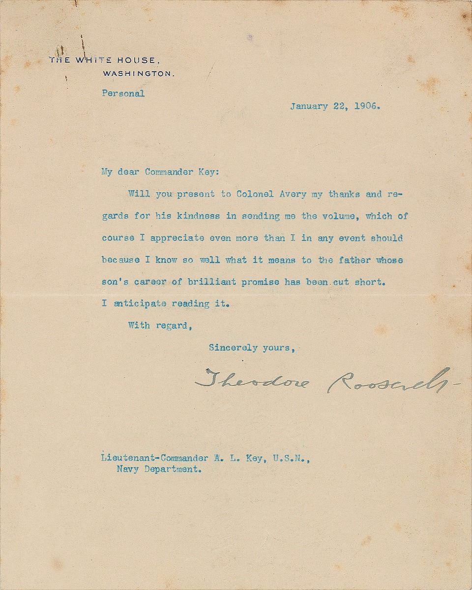 TLS as president, one page, 7 x 8.75, White House letterhead, January 22, 1906. Letter to Lieutenant Commander A. L. Key, in full: “Will you present to Colonel Avery my thanks and regards for his kindness in sending me the volume, which of course I appreciate even more than I in any event should because I know so well what it means to the father whose son’s career of brilliant promise has been cut short. I anticipate reading it.” In very good to fine condition, with rusty paper clip mark to upper left corner, and scattered foxing primarily to margins. Accompanied by the original mailing envelope and the aforesaid volume, Idle Comments by Isaac Erwin Avery. Also accompanied by correspondence between the recipient, the father of the author, A. C. Avery, and a North Carolinian businessman named Julian Carr. As the city editor for the Charlotte Observer, Isaac Erwin Avery earned considerable publicity for his Monday morning editorials, Variety of Idle Comments, for which the included book chronicles. Roosevelt’s mention of “cut short” is in reference to Avery’s tragic suicide at the age of thirty-three.
