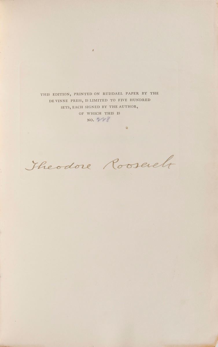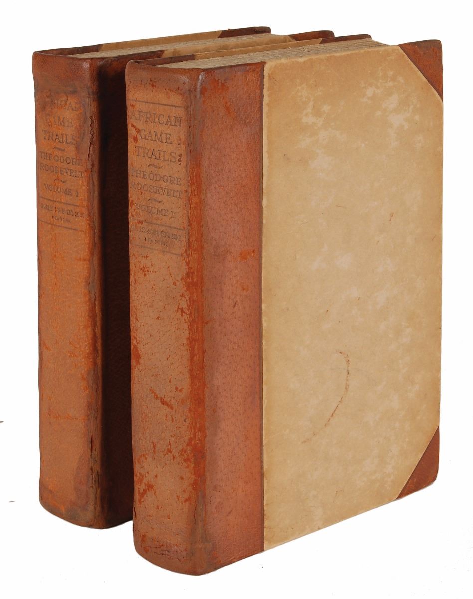 Sought-after signed book: African Game Trails, Volumes I and II. Limited edition, numbered 228/500. NY: Charles Scribner's Sons, 1910. Hardcover, 7 x 10, 529 total pages. Signed on the colophon inside the first volume in fountain pen, “Theodore Roosevelt.” Autographic Condition: fine condition. Book condition: VG-/None; Volume I has been rebacked with the spine laid down and Volume II has some expert restoration.