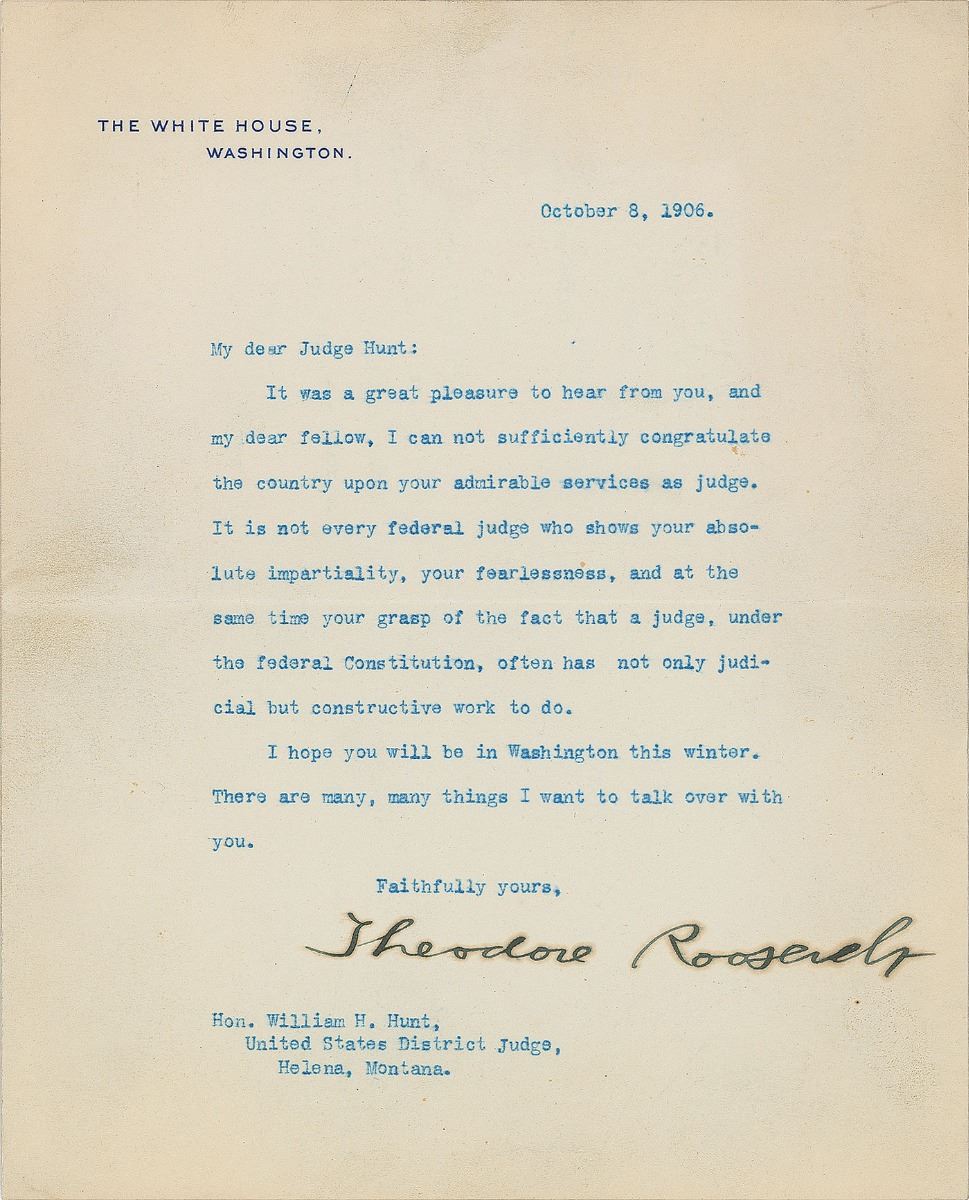 TLS as president, one page, 7 x 8.75, White House letterhead, October 8, 1906. Letter to prominent lawyer and judge William Henry Hunt. In full: “It was a great pleasure to hear from you, and my dear fellow, I can not sufficiently congratulate the country upon your admirable services as judge. It is not every federal judge who shows your absolute impartiality, your fearlessness, and at the same time your grasp of the fact that a judge, under the federal Constitution, often has not only judicial but constructive work to do. I hope you will be in Washington this winter. There are many, many things I want to talk over with you.” In fine condition.