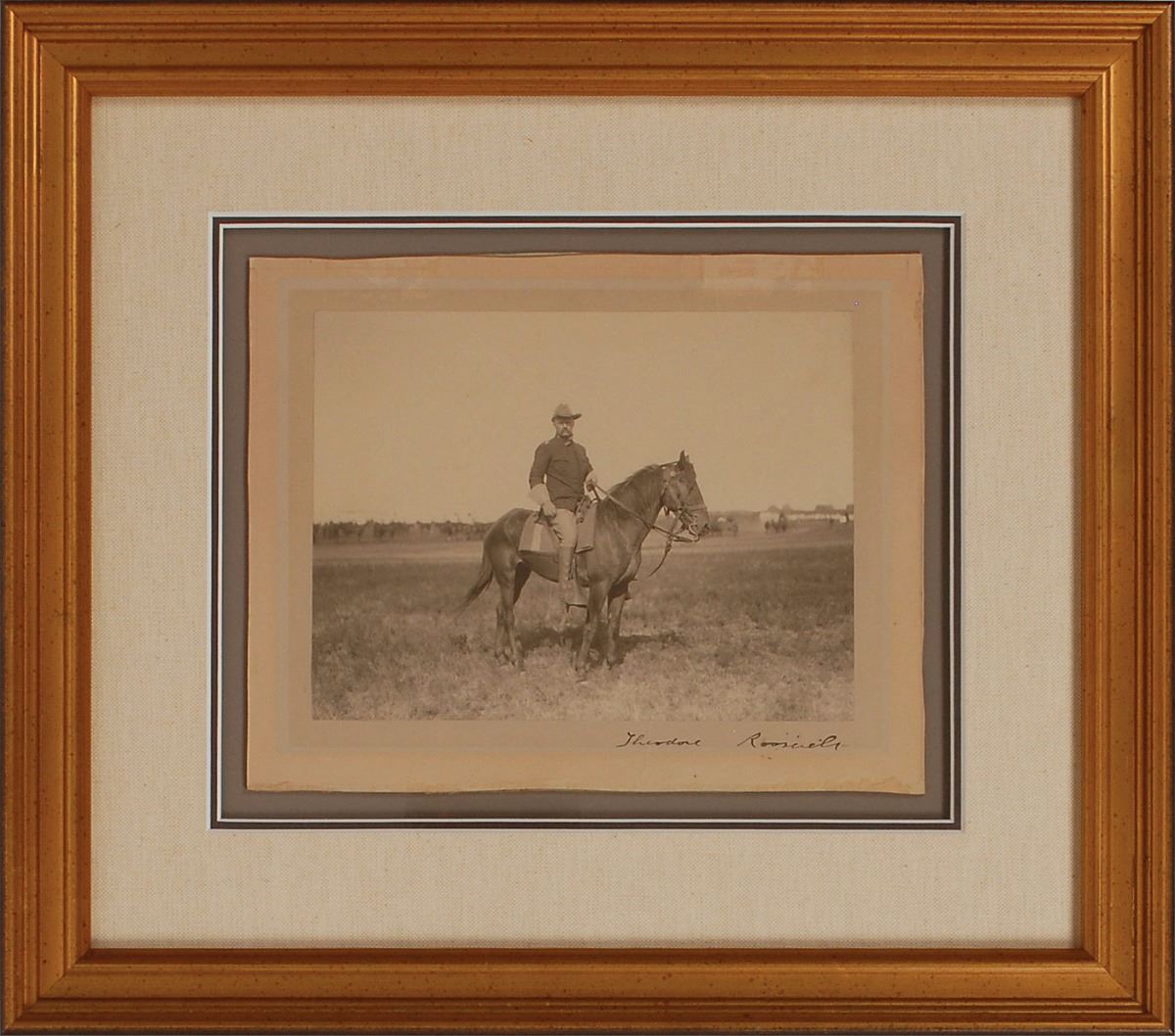 Magnificent vintage matte-finish 8 x 6 photo of Roosevelt sitting atop a horse amid an open field, affixed to its original mount, nicely signed on the mount in black ink. Archivally mounted, cloth-matted, and framed to an overall size of 17 x 15. In fine condition, with light surface damage to the perimeter of the trimmed mount, not at all affecting the crystal clear image or signature.