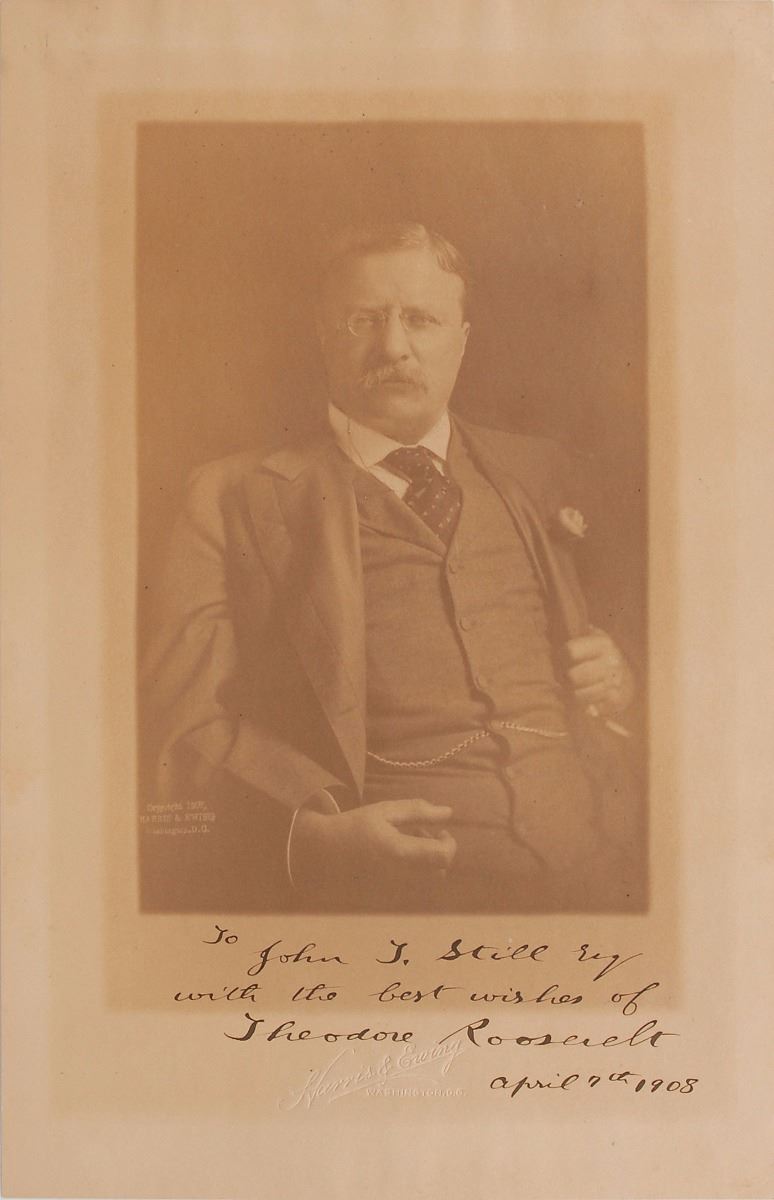 Tremendous vintage sepia matte-finish 8.75 x 13.5 half-length portrait of Roosevelt by Harris & Ewing, signed and inscribed as president in fountain pen, “To John T. Still Esq, with the best wishes of Theodore Roosevelt, April 7th, 1908.” Blindstamped below the signature by the photography studio. In fine condition.