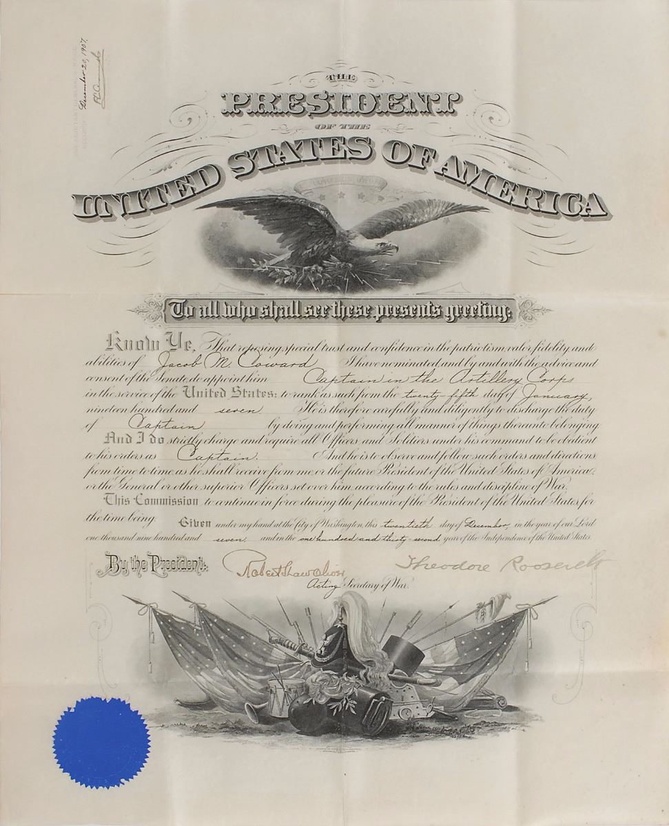 Partly-printed vellum DS as president, one page, 15.75 x 19.5, December 20, 1907. President Roosevelt appoints Jacob M. Coward as “Captain in the Artillery Corps in the service of the United States.” Signed at the conclusion by Roosevelt, and countersigned by Robert Shaw Oliver as acting secretary of war. Embossed blue seal affixed to lower left remains intact. In fine condition. Accompanied by a full letter of authenticity from PSA/DNA.