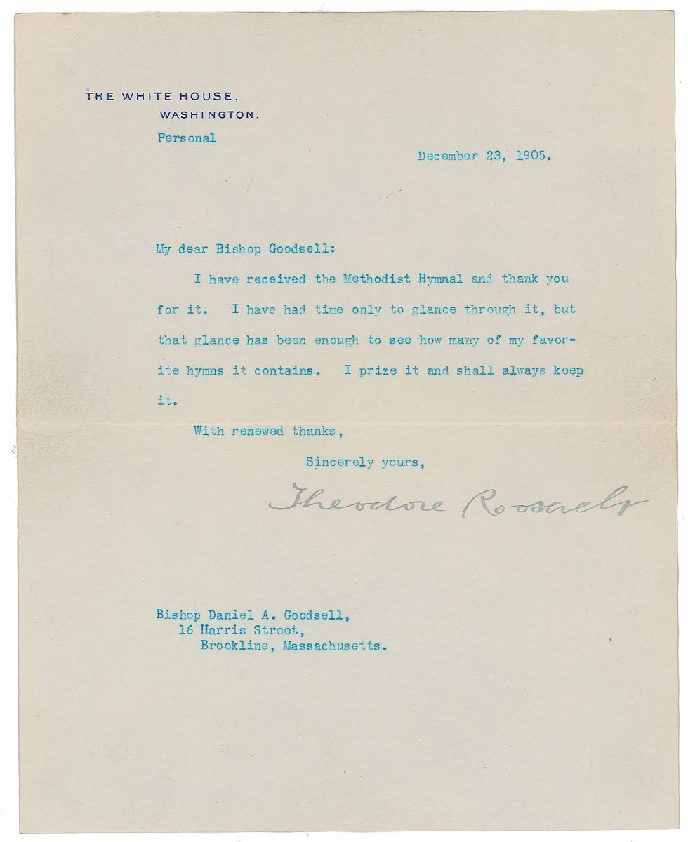 TLS as president, one page, 7 x 8.75, White House letterhead, December 23, 1905. Letter to Bishop Daniel A. Goodsell, in full: “I have received the Methodist Hymnal and thank you for it. I have had time only to glance through it, but that glance has been enough to see how many of my favorite hymns it contains. I prize it and shall always keep it.” In fine condition. Accompanied by the original mailing envelope.