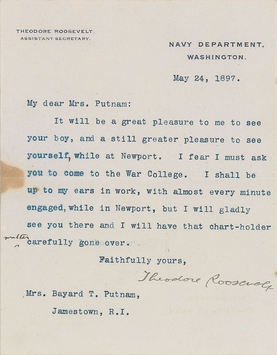 TLS, one page, 5.25 x 6.75, Navy Department letterhead, May 24, 1897. Letter to Mrs. Bayard T. Putnam, in part: “It will be a great pleasure to me to see your boy, and a still greater pleasure to see yourself, while at Newport. I fear I must ask you to come to the War College. I shall be up to my ears in work, with almost every minute engaged, while in Newport, but I will gladly see you there and I will have that chart-holder matter carefully gone over.” In fine condition, with a small stain to the left edge.