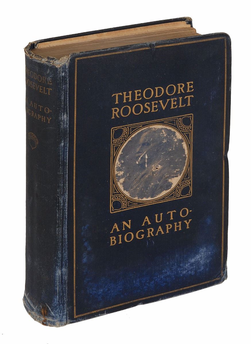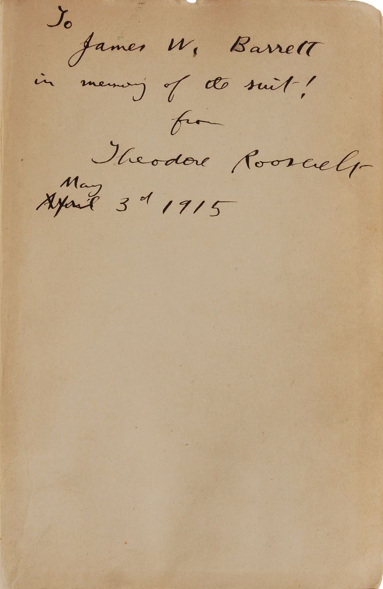 Signed book: Theodore Roosevelt: An Autobiography. First edition. NY: The Macmillan Company, 1913. Hardcover, 6.25 x 8.75, 647 pages. Boldly signed and inscribed on the first free end page in black ink, “To James W. Barrett, in memory of the suit! from Theodore Roosevelt, May 3d 1915.” Autographic condition: fine. Book condition: VG-/None, with edgewear, heavy rubbing to boards, and binding slightly loose.