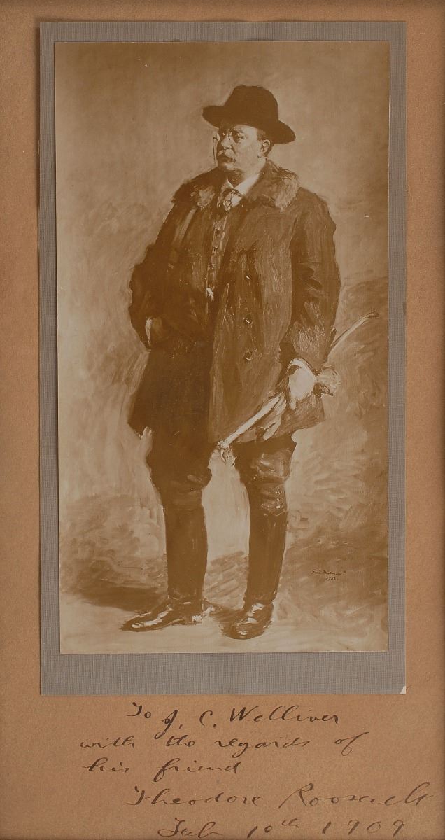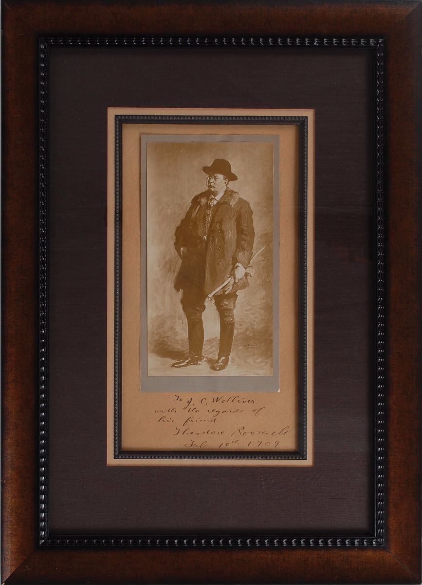Fantastic matte-finish 4.5 x 8.5 photo of artist Gari Melchers’s full-length portrait of Roosevelt, affixed to a 6.5 x 12.5 mount, boldly signed and inscribed on the mount in fountain pen as president, “To J. C. Welliver with the regards of his friend Theodore Roosevelt, Feb. 10th 1909.” Handsomely cloth-matted and framed to an overall size of 15.5 x 21.75. In fine condition. Melchers’s painting of President Roosevelt was commissioned by industrialist and art collector Charles Freer as a sign of appreciation for his support; Freer pledged his collections to the United States as long as a public museum was built for them, and the president interceded with the Smithsonian in order to make it happen. Melchers’s superb painting aptly captures Roosevelt in an unusual pose and embodies his policy to ‘speak softly and carry a big stick.’
