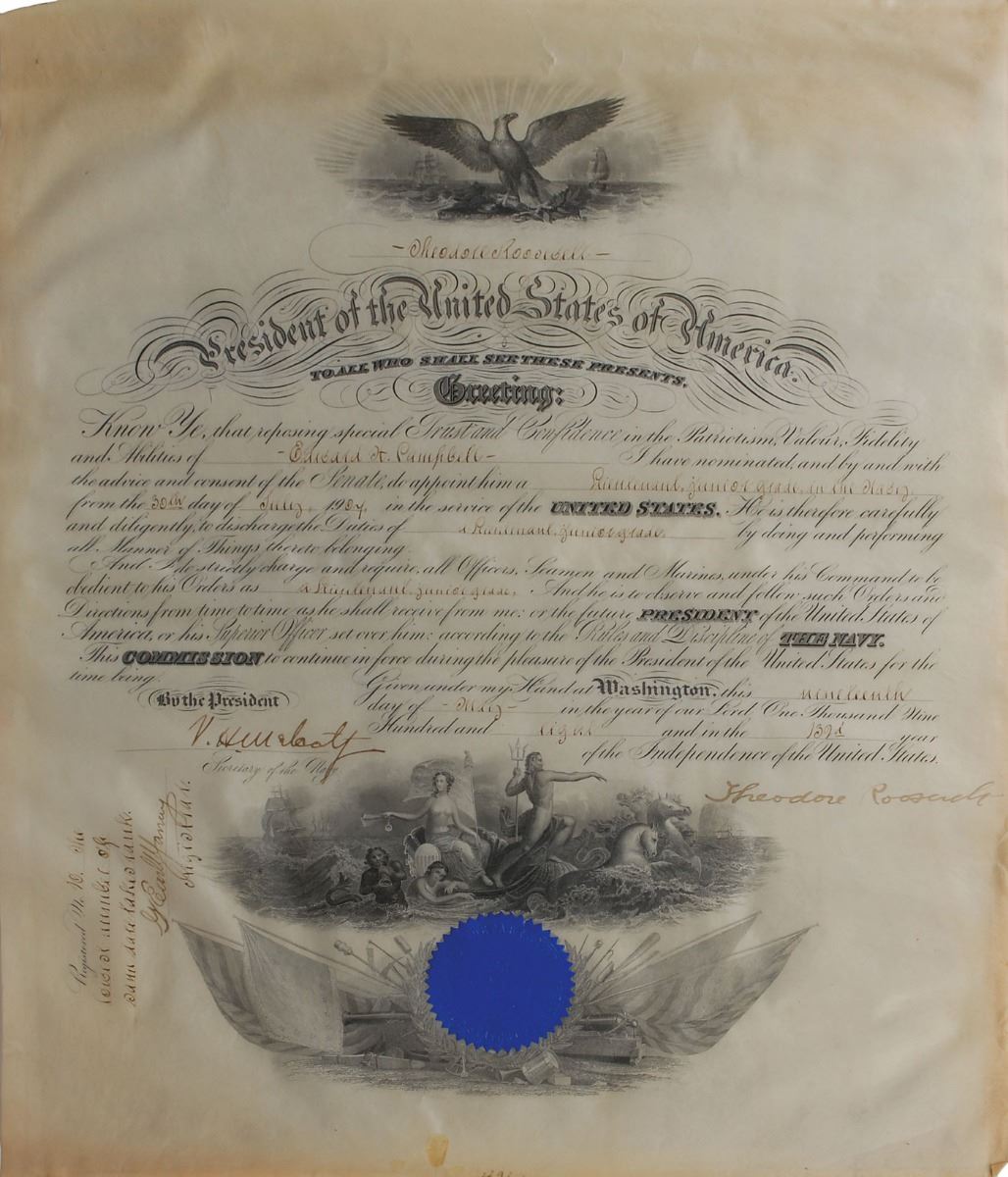 Partly-printed vellum DS as president, one page, 15.5 x 19, May 19, 1908. President Roosevelt appoints Edward H. Campbell as “Lieutenant, junior grade, in the Navy…in the service of the United States.” Signed at the conclusion by Roosevelt, and countersigned by Secretary of the Navy Victor H. Metcalf. Embossed blue Navy Department seal remains affixed to center of lower vignette. In fine condition, with moderate overall rippling. Documents relating to the Navy, one of Roosevelt’s greatest passions, both before and during his presidency, remain exceedingly sought-after.
