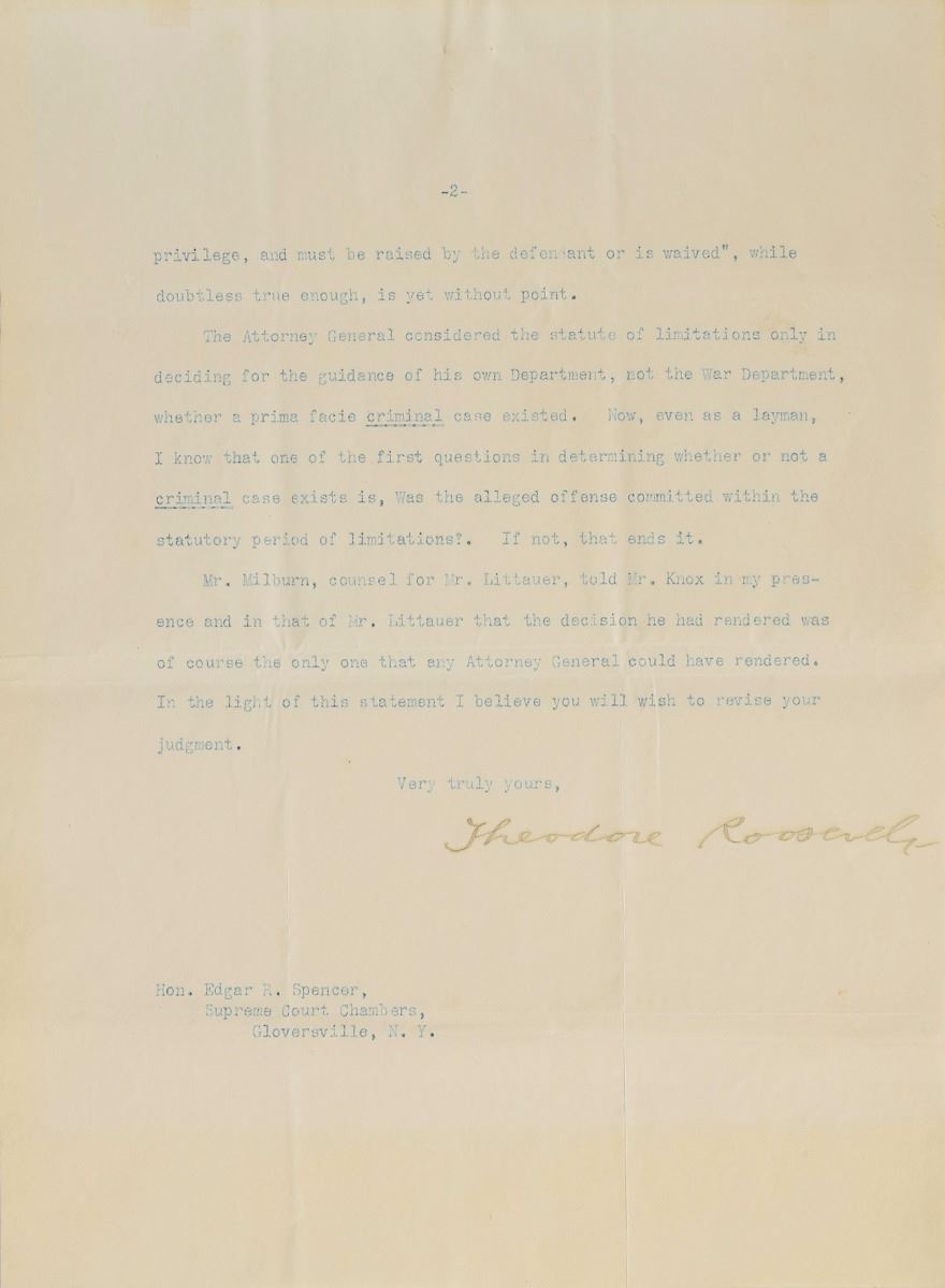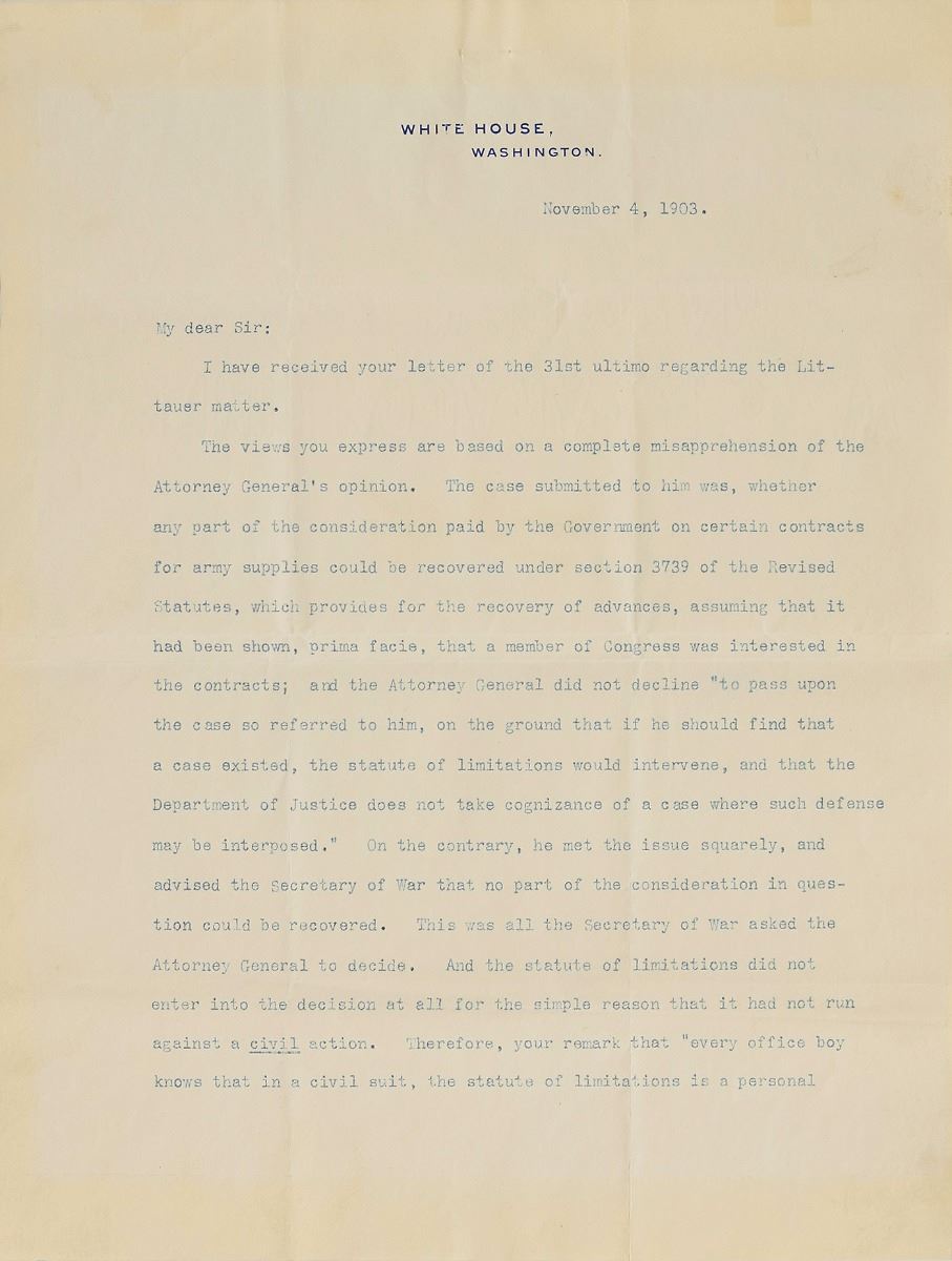 TLS as president, two pages, 8 x 10.5, White House letterhead, November 4, 1903. Letter to Judge Edgar R. Spencer, in full: "I have received your letter of the 31st ultimo regarding the Littauer matter. The views you express are based on a complete misapprehension of the Attorney General's opinion. The case submitted to him was, whether any part of the consideration paid by the Government on certain contracts for army supplies could be recovered under section 3739 of the Revised Statutes, which provides for the recovery of advances, assuming that it had been shown, prima facie, that a member of Congress was interested in the contracts; and the Attorney General did not decline 'to pass upon the case so referred to him, on the ground that if he should find that a case existed, the statute of limitations would intervene, and that the Department of Justice does not take cognizance of a case where such defense may be interposed.' On the contrary, he met the issue squarely, and advised the Secretary of War that no part of the consideration in question could be recovered. This was all the Secretary of War asked the Attorney to decide. And the statute of limitations did not enter into the decision at all for the simple reason that it had not run against a civil action. Therefore, your remark that 'every office boy knows that in a civil suit, the statute of limitations is a personal privilege, and must be raised by the defendant or is waived,' while doubtless true enough, is yet without point. The Attorney General considered the statute of limitations only in deciding for the guidance of his own Department, not the War Department, whether a prima facie criminal case existed. Now, even as a layman, I know that one of the first questions in determining whether or not a criminal case exists is, Was the alleged offense committed within the statutory period of limitations? If not, that ends it. Mr. Milburn, counsel of Mr. Littauer, told Mr. Knox in my presence and in that of Mr. Littauer that the decision he had rendered was of course the only one that any Attorney General could have rendered. In light of this statement I believe you will wish to revise your judgment." Accompanied by the original letter from Spencer, as well as a series of correspondence between Spencer and the aforementioned Lucius Littauer. In very good to fine condition, with light wrinkling, intersecting folds, and a staple hole to the top.