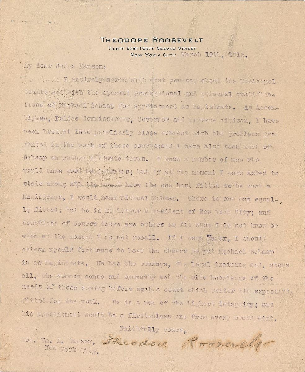 TLS, one page, 7.75 x 9.25, personal letterhead, March 19, 1915. Letter to his friend Judge William L. Ransom. In part: "I agree entirely with what you say about the Municipal Courts and with the special professional and personal qualifications of Michael Schaap for appointment as Magistrate. As Assemblyman, Police Commissioner, Governor and private citizen, I have been brought into peculiarly close contact with the problems presented in the work of these courts…I know a number of men who would make good magistrates; but if that the moment I were asked to state among all the men I know the one best fitted to be such a Magistrate, I would name Michael Schaap…If I were Mayor, I should esteem myself fortunate to have the chance to put Michael Schaap in as Magistrate." In very good to fine condition, with staple holes to the upper left corner, the type a couple of shades light, and slight blurring to Roosevelt's signature.