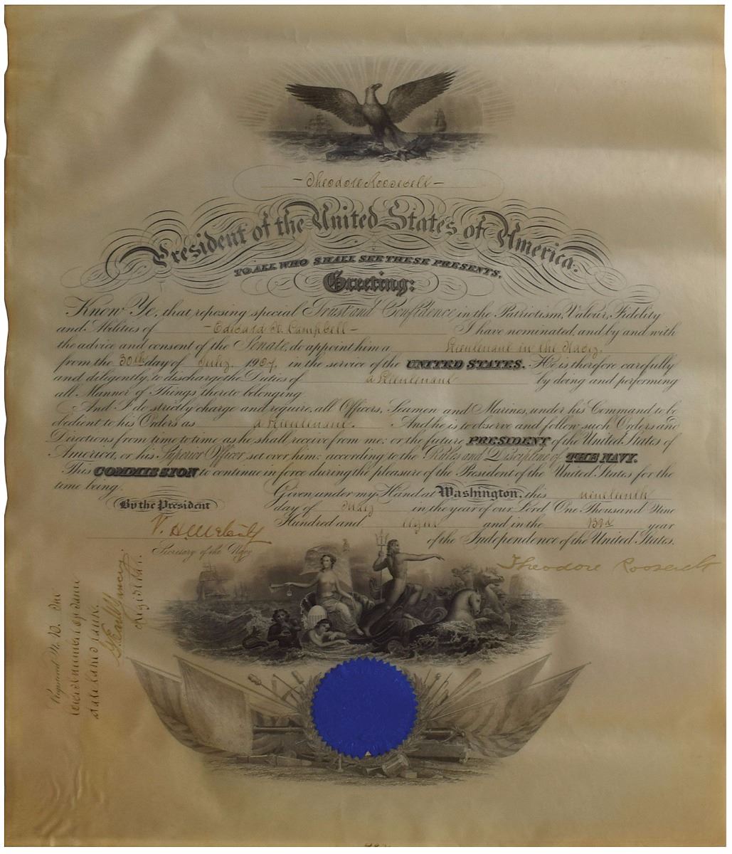 Partly-printed vellum DS as president, one page, 15.5 x 19, May 19, 1908. President Roosevelt appoints Edward H. Campbell as "Lieutenant in the Navy…in the service of the United States." Signed at the conclusion by Roosevelt, and countersigned by Victor H. Metcalf as Secretary of the Navy, with the blue Navy Department seal affixed to lower vignette. Rolled and in very good to fine condition, with moderate overall rippling. Naval documents signed by President Roosevelt are among the most desirable given his brief yet notable tenure as Assistant Secretary of the Navy.