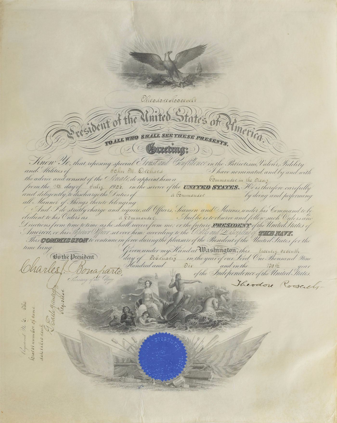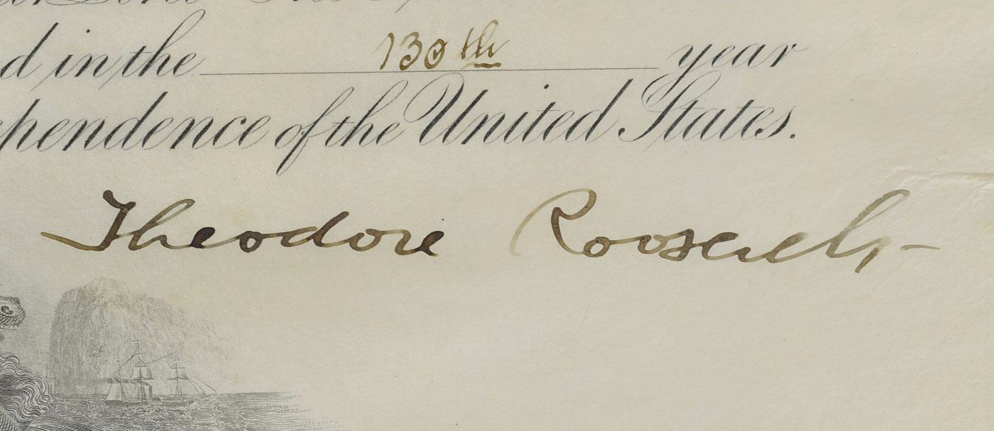 Desirable partly-printed vellum DS as president, one page, 15.75 x 19.75, February 27, 1906. President Roosevelt appoints John M. Orchard as a "Commander in the Navy." Boldly signed at the conclusion by Roosevelt, and countersigned by Secretary of the Navy Charles J. Bonaparte. Blue Navy Department seal remains affixed to lower vignette. In fine condition. Naval documents signed by President Roosevelt are among the most desirable given his brief yet notable tenure as Assistant Secretary of the Navy.