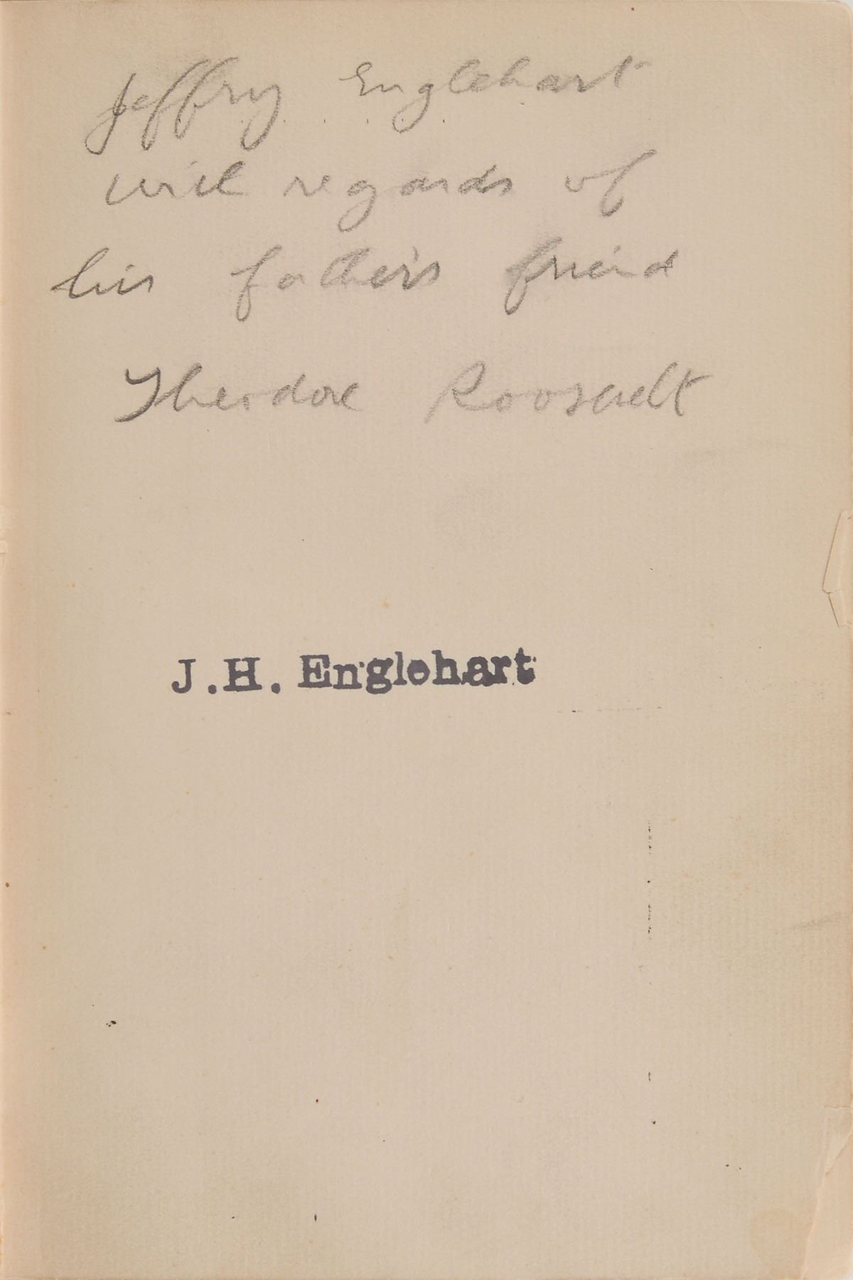 Signed book: Theodore Roosevelt: The American. Later printing. London and New York: F. Tennyson Neely, 1899. Hardcover, 5.5 x 8, 218 pages. Signed and inscribed on the first free end page in pencil, "Jeffrey Englehart, with regards of his father's friend, Theodore Roosevelt." An ownership stamp appears below the signature. Autographic condition: very good to fine, with chipping to the right edge of the signed page, and some light smudging to the pencil. Book condition: VG-/None.