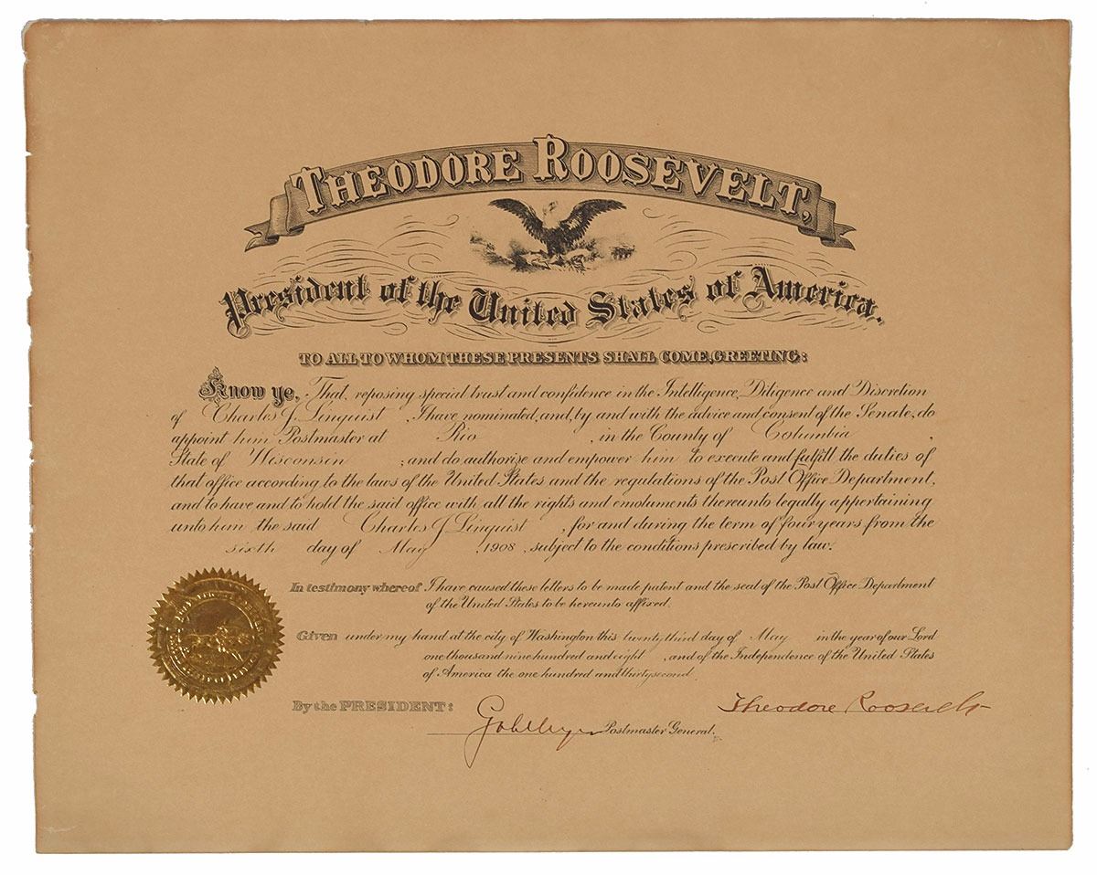 Partly-printed DS as president, one page, 20 x 16, May 23, 1908. President Roosevelt appoints Charles Linquist as "Postmaster at Rio, in the County of Columbia, State of Wisconsin." Boldly signed at the conclusion by President Roosevelt and countersigned by Postmaster General George von L. Meyer. In fine condition, with a crease to the upper right corner and very slight chipping along the left edge.