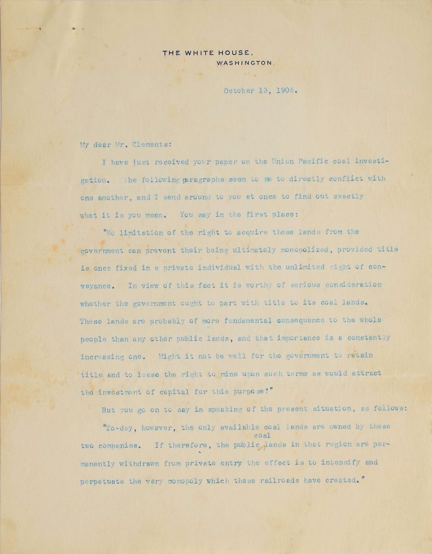 TLS as president, two pages, 8 x 10.5, White House letterhead, October 13, 1906. Letter to Judson C. Clements, acting chairman of the Interstate Commerce Commission. In part: "I have just received your paper on the Union Pacific coal investigation. The following paragraphs seem to me to directly conflict with one another…You say in the first place: 'No limitation of the right to acquire these lands from the government can prevent their being ultimately monopolized, provided title is once fixed in a private individual with the unlimited right of conveyance. In view of this fact it is worthy of serious consideration whether the government ought to part with title to its coal lands. These lands are probably of more fundamental consequence to the whole people than any other public lands…Might it not be well for the government to retain title and to lease the right to mine upon such terms as would attract the investment of capital for this purpose?'