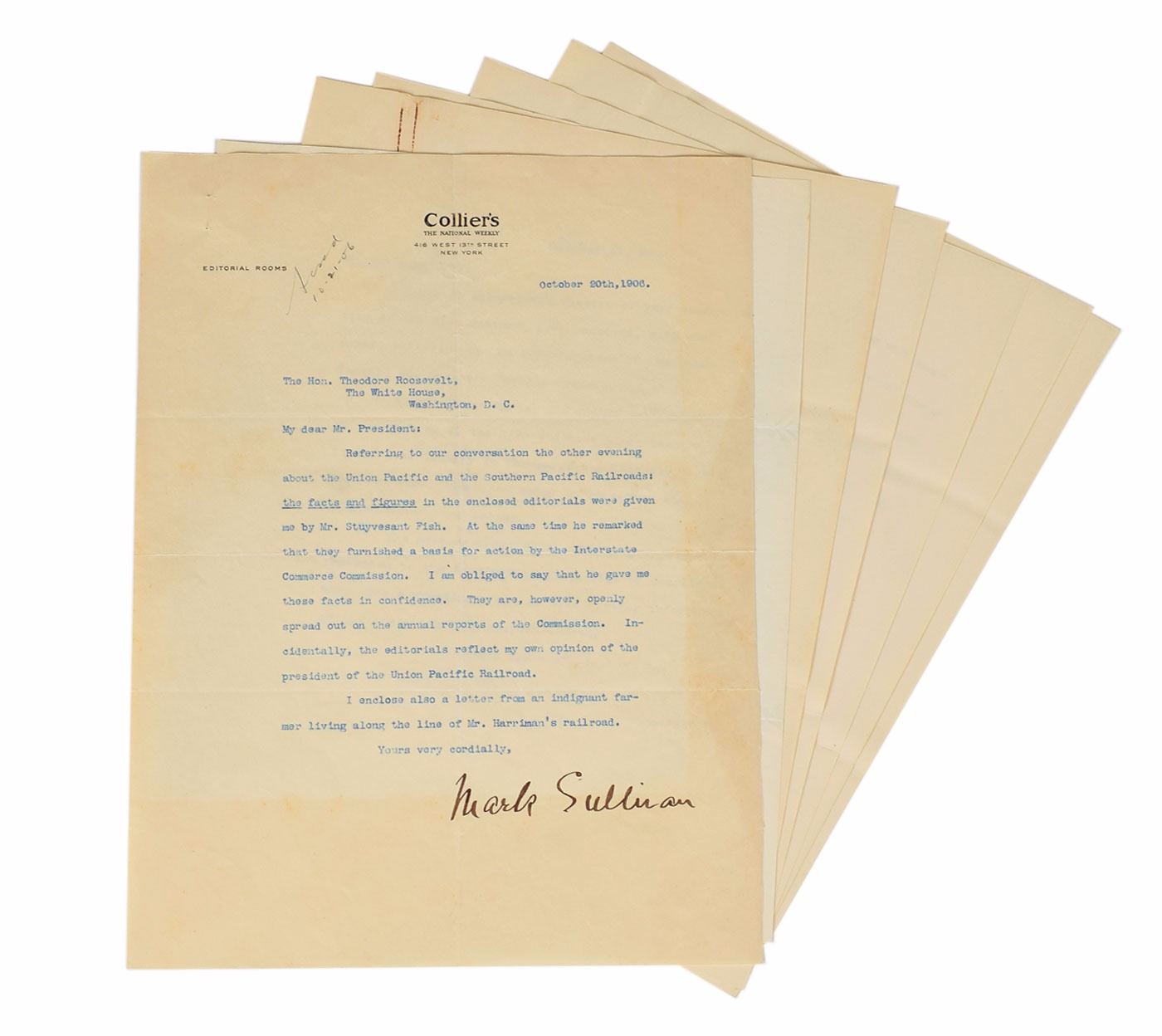 But you go on to say in speaking of the present situation, as follows: 'To-day, however, the only available coal lands are owned by these two companies. If therefore, the public coal lands in that region are permanently withdrawn from private entry the effect is to intensify and perpetuate the very monopoly which these railroads have created.' I am inclined cordially to agree with the first of these two statements; but the second seems to flatly contradict it…I will back you up to the limit in compelling the railroad companies to afford the independent producers proper track connections and proper transportation facilities as well as to carry the coal for reasonable charges. But I feel very strongly that your first position, which is that we should not part with any more coal lands, is correct, in which case your second position, that we should not withdraw public coal lands from private entry can not but be incorrect." In fine condition, with staple holes to the upper left, and light foxing to the first page. Accompanied by a TLS to Roosevelt by Collier's editor Mark Sullivan, pertaining to a conversation "about the Union Pacific and the Southern Pacific Railroads," a typed copy of a letter to the president from a commissioner in the investigation, and a typed copy of a letter outlining general concerns with the investigation.