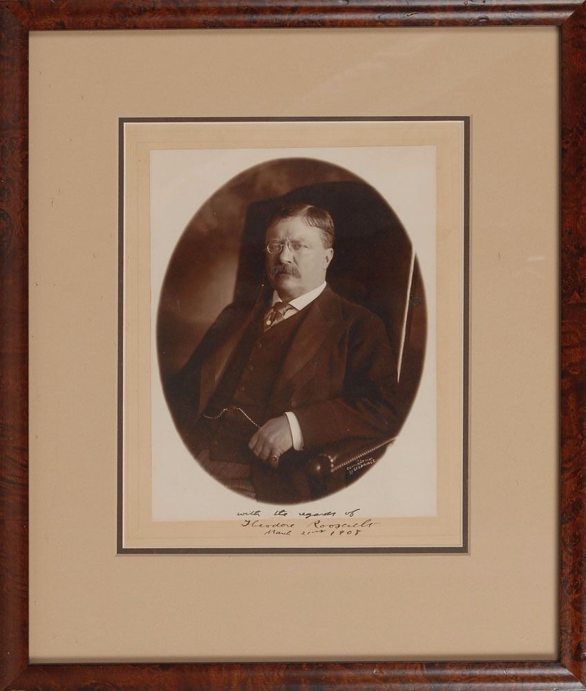 Magnificent matte-finish 9 x 11 portrait of President Roosevelt taken in 1907 by George Prince affixed to its original mount, signed at the bottom in black ink as president, "With the regards of Theodore Roosevelt, March 21st 1908." Archivally double-matted and framed to an overall size of 15.5 x 18.5. In fine condition. A marvelous, crystal-clear signed portrait.