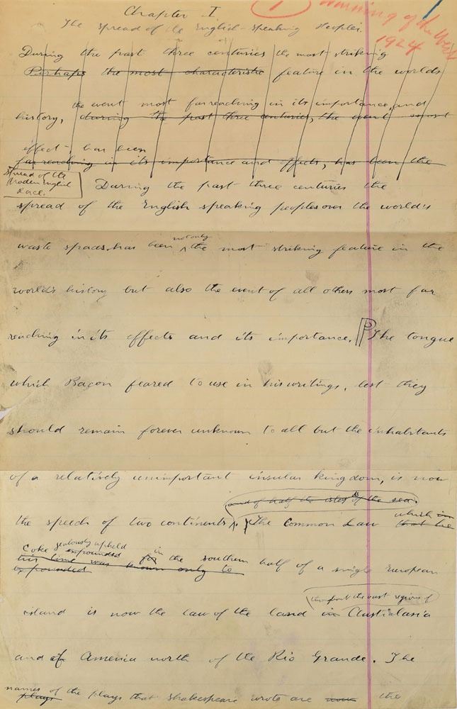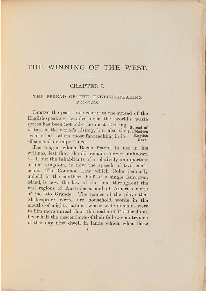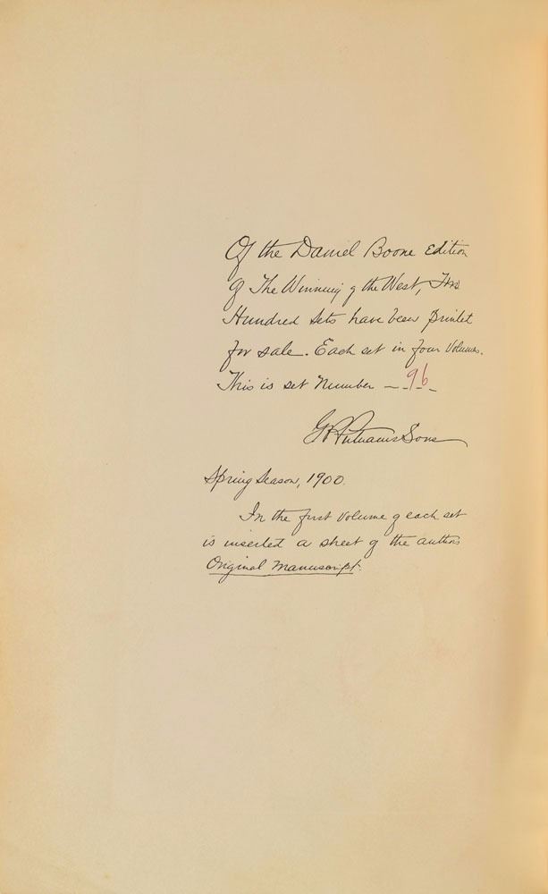 Magnificent limited edition book, containing an original handwritten manuscript leaf from Roosevelt's draft: The Winning of the West, Volumes I–IV. Daniel Boone Edition, limited issue, numbered 96/200. NY: G. P. Putnam's Sons/Knickerbocker Press, 1900. Leatherbound hardcover in original publisher’s full decorated morocco, leather doublures and suede endpapers, gilt top edges, 7.25 x 10.25. Inlaid opposite the colophon is the first page from Roosevelt's handwritten manuscript, 12.25 x 8, headed, "Chapter I. The Spread of the English-Speaking Peoples." The first few lines are struck through, and the manuscript begins in earnest: "During the past three centuries the spread of the English speaking peoples over the world's waste spaces has been not only the most striking feature in the world's history but also the event of all others most far reaching in its effects and its importance. The tongue which Bacon feared to use in his writings, lest they should remain forever unknown to all but the inhabitants of a relatively unimportant insular kingdom, is now the speech of two continents. The Common Law which Coke jealously upheld in the southern half of a single European island is now the law of the land throughout vast regions of Australasia and of America north of the Rio Grande. The names of the plays that Shakespeare wrote are [household words in the mouths of mighty nations]." Autographic condition: very good to fine, with scattered ink fingerprints and a small cut to the left edge of the manuscript page. Book condition: VG/None, with well-done minor restorations to exterior joints, and slight wear to spines; the bookplate of John Stuart Groves is affixed inside the front of each volume. An exceptionally handsome set in a deluxe binding.