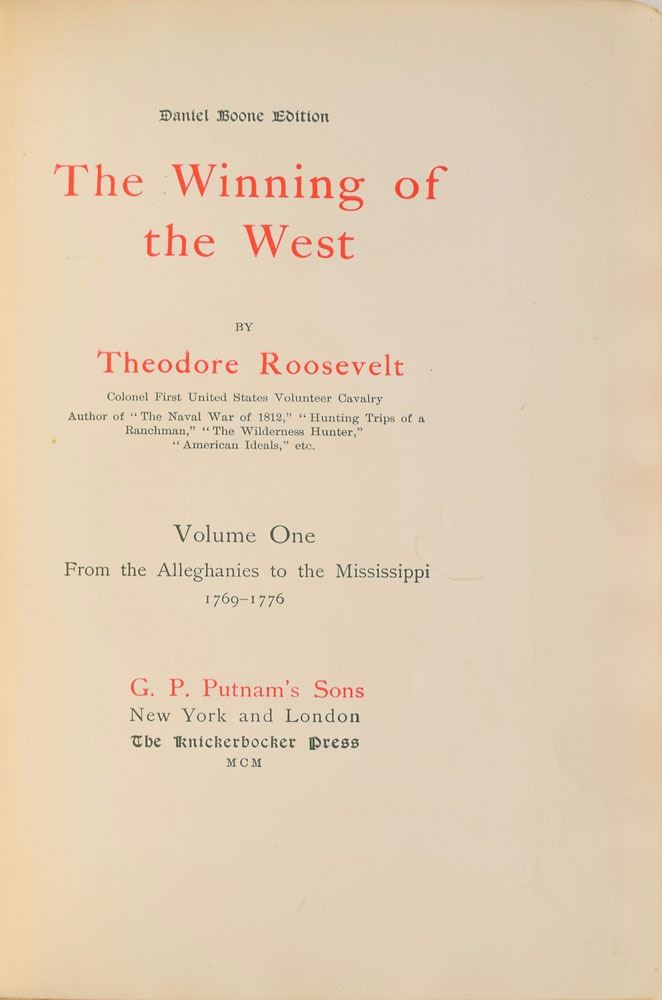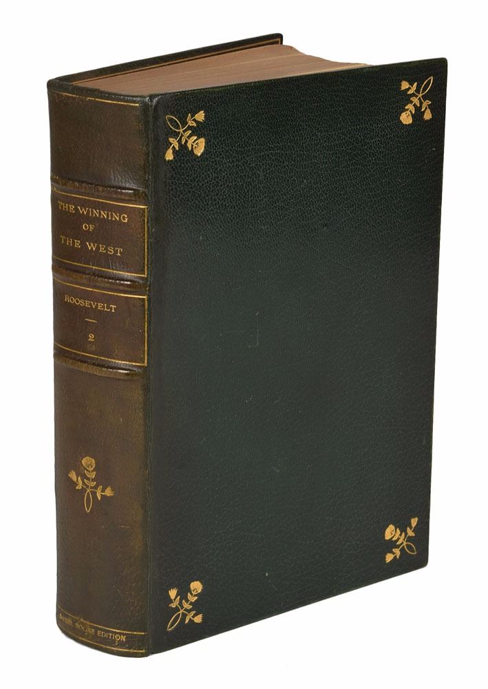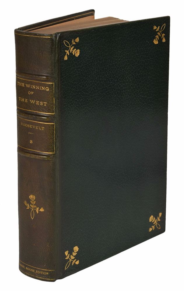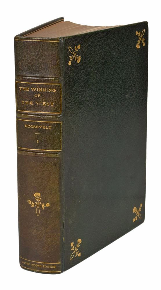 An absolutely stunning special edition featuring a page from Roosevelt's handwritten draft—but for minor grammatical changes, the words penned here by Roosevelt are precisely how this hefty work opens, following a lengthy preface and foreword. Roosevelt was a prolific author, and in fact had first come to prominence as a serious historian with the two-volume work The Naval War of 1812. He turned to writing The Winning of the West, his most ambitious work, after suffering defeat in the 1886 election for mayor of New York City. Tracing the history of American westward expansion, it was first published in four volumes by G. P. Putnam's Sons between 1889 and 1896. This special 'Daniel Boone' edition was released in 1900, with Volume I in each set containing a leaf of the original draft; of the two hundred sets produced, approximately half were issued in this green full leather deluxe binding.