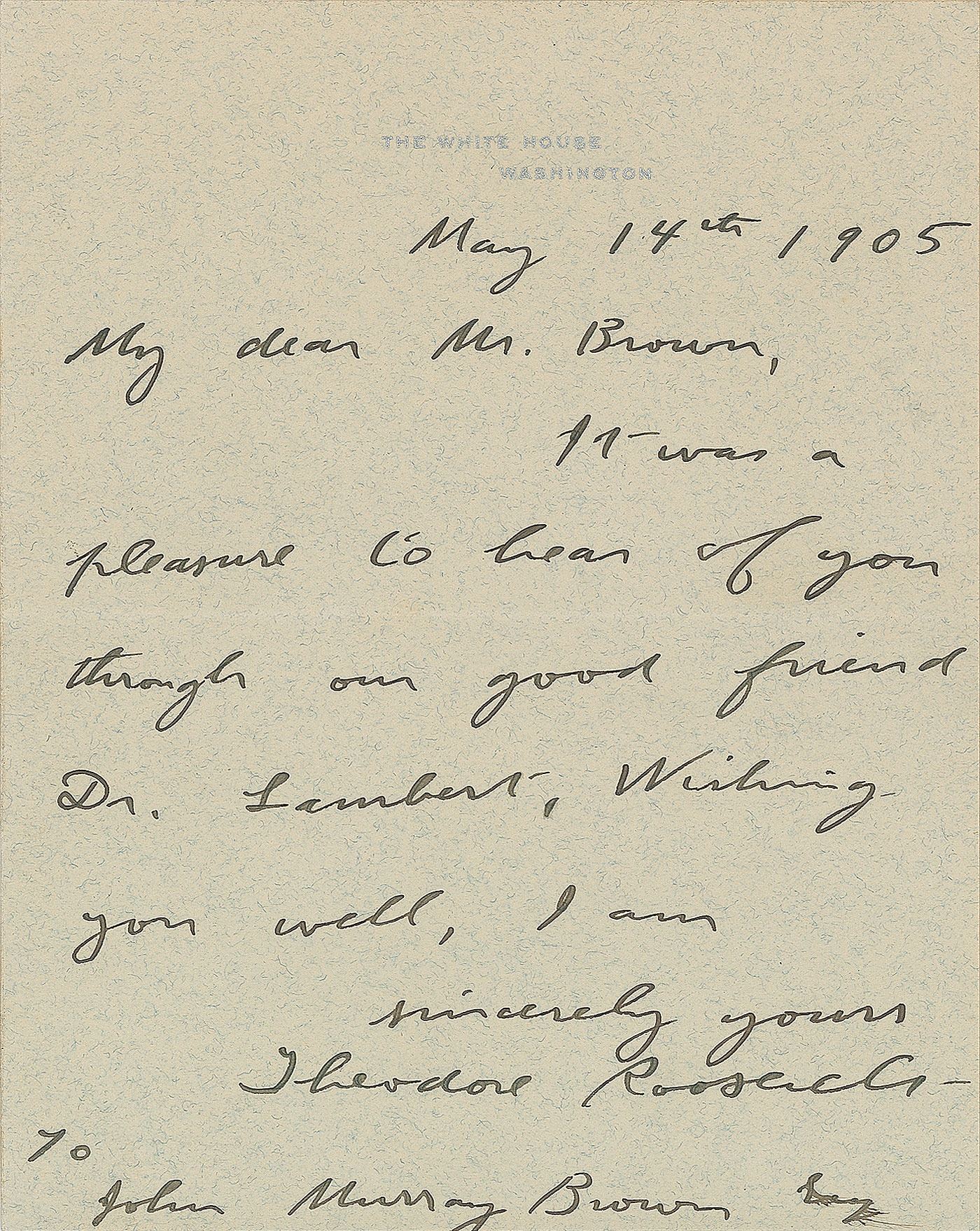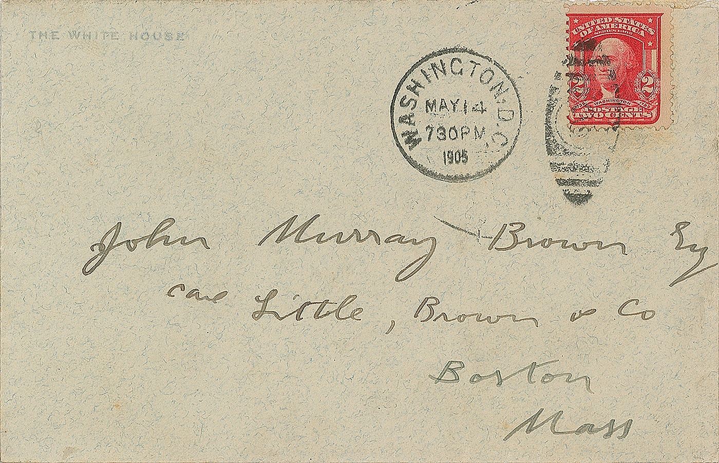 ALS as president, one page, White House letterhead, May 14, 1905. Letter to John Murray Brown, in full: "It was a pleasure to hear of you through our good friend Dr. Lambert. Wishing you well." In fine condition. Accompanied by the original White House mailing envelope, addressed in Roosevelt's own hand. Little, Brown and Company was founded in 1837 by Charles Little and James Brown. The latter's son, John Murray Brown, took over the company in 1884 and by the 1890s, had expanded the company into general publishing, which now included works of fiction. In 1901, the same year Roosevelt was sworn into office, he published The Naval Operations of the War between Great Britain and the United States, 1812–1815, through Little, Brown, and Company; additionally, the year he wrote this this letter, Roosevelt published the hunting book Outdoor Pastimes of an American Hunter with Charles Scribner's Sons. An extremely appealing handwritten letter from Roosevelt, whose prolific literary career sets him apart from all other presidential scribes.