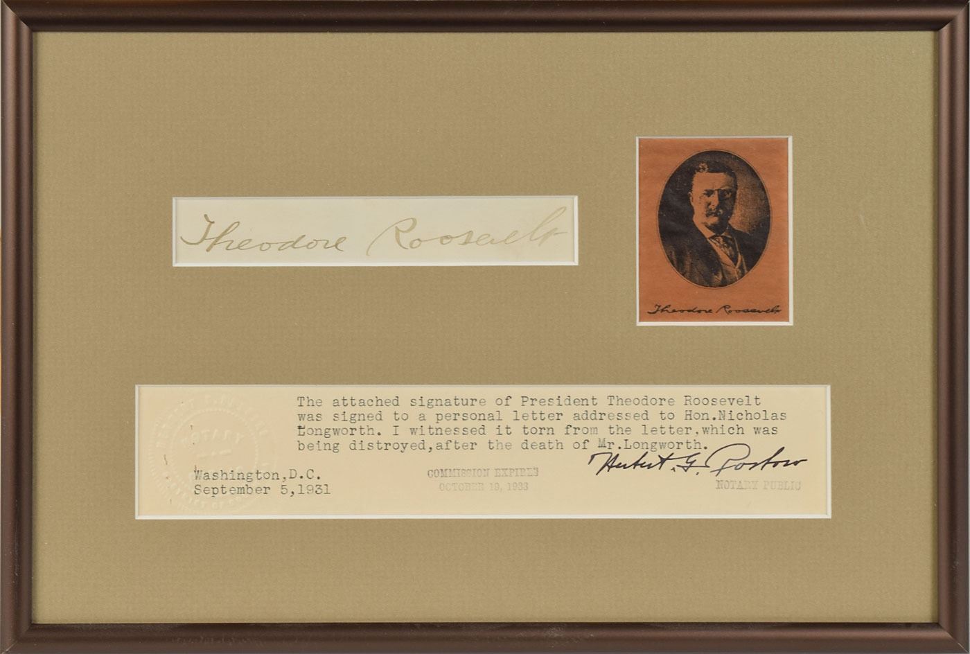 Desirable ink signature, "Theodore Roosevelt,” on an off-white 4.5 x .75 slip. Matted and framed with a small image of Roosevelt and a notarized letter of provenance affirming that the signature derives from "a personal letter addressed to Hon. Nicholas Longworth," to an overall size of 11.25 x 7.5. In fine condition.