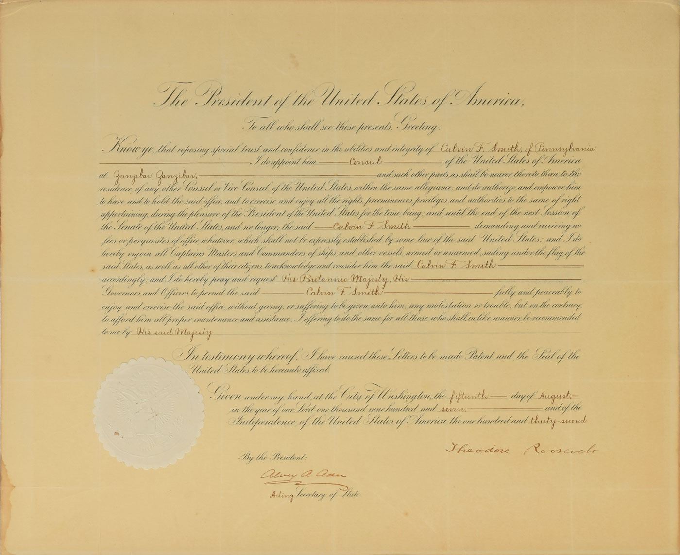 Partly-printed DS as president, one page, 22 x 18, August 15, 1907. President Roosevelt appoints Calvin F. Smith as "Consul of the United States of America at Zanzibar, Zanzibar." Neatly signed at the conclusion by President Roosevelt and countersigned by Secretary of State Alvey A. Ader. The crisply embossed white paper seal affixed to the lower left remains fully intact. Mounted to a same-size board and in very good condition, with intersecting folds, creasing, and a stain to the lower left edge.