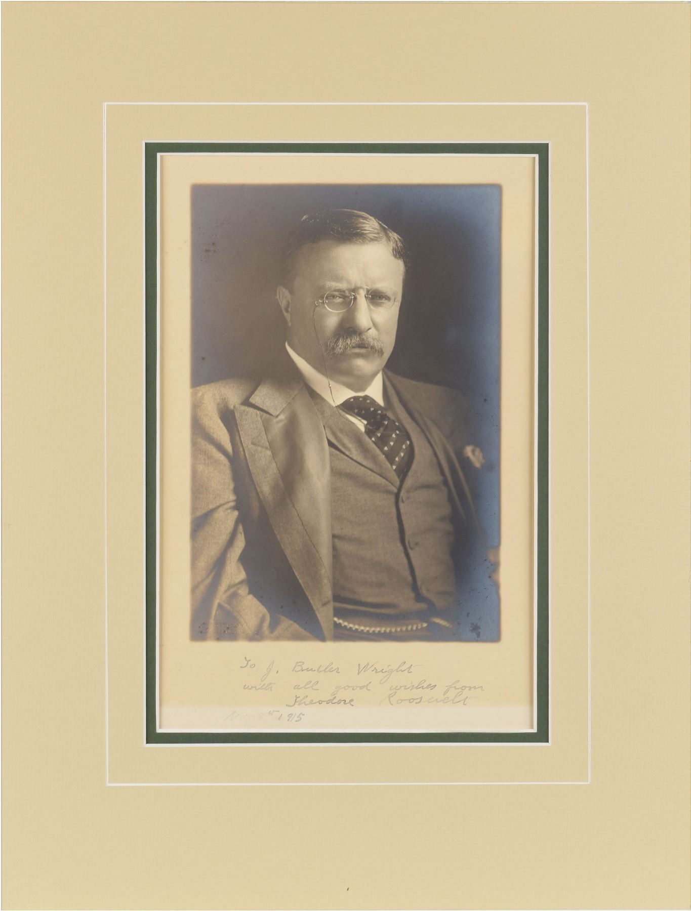 Desirable matte-finish 7.25 x 11.25 half-length portrait of Roosevelt in a terrifically confident pose by Harris & Ewing of Washington, D.C., signed and inscribed in fountain pen, "To J. Butler Wright, with all good wishes from, Theodore Roosevelt, Nov. 8th, 1915.” Lower left bears the photography studio blindstamp. Double-matted to an overall size of 13.25 x 17.75. In fine condition, with light silvering to the darker areas of the image. Wright was a United States diplomat who served as the twentieth and last Third Assistant Secretary of State.