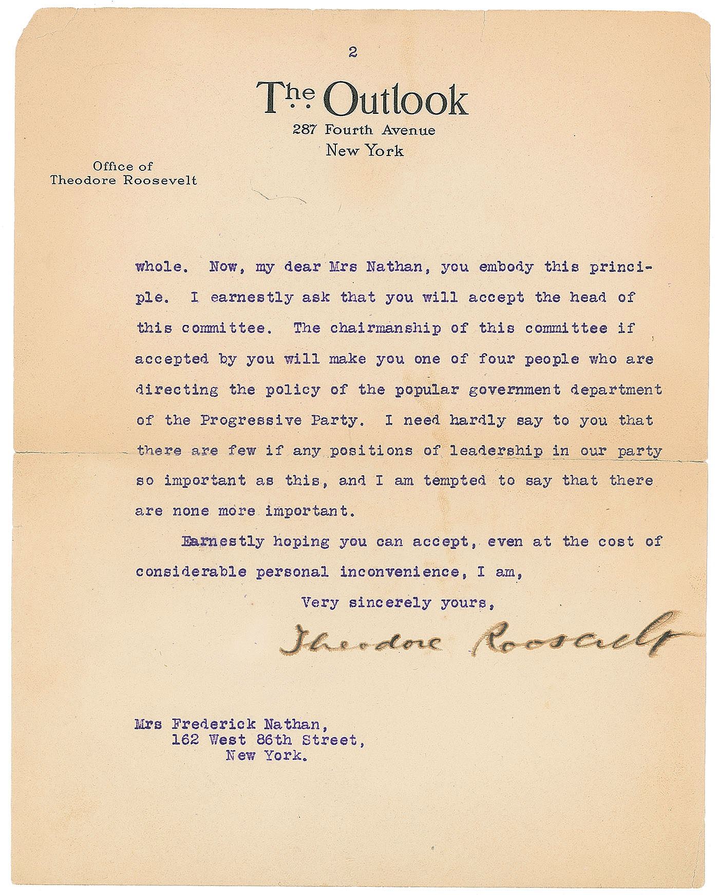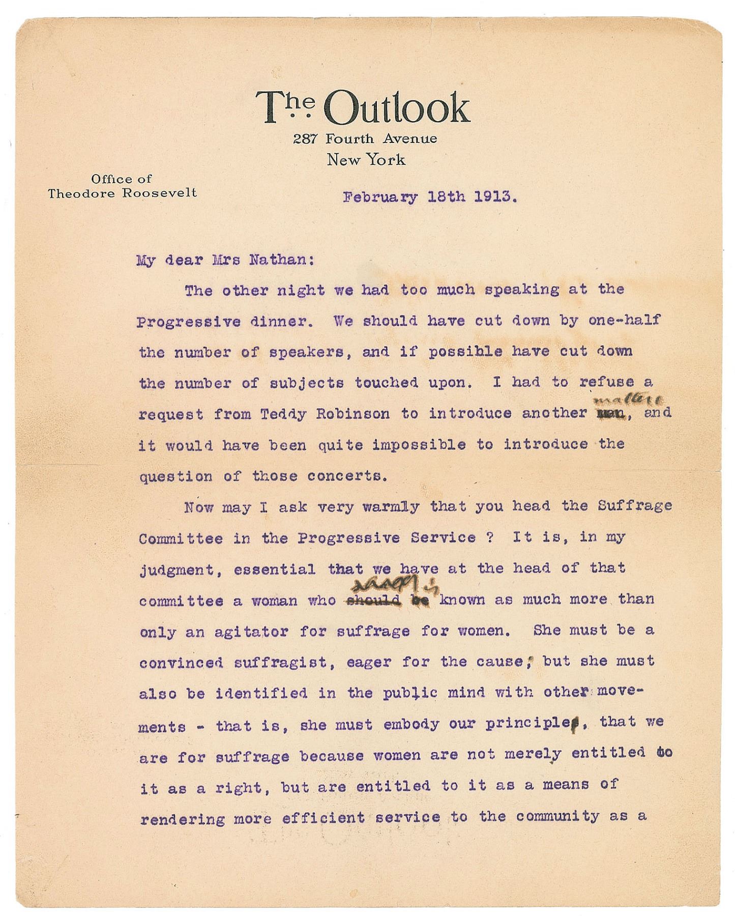 TLS, two pages, 7.5 x 9.5, The Outlook letterhead, February 18, 1913. Letter to Maud Nathan, in full: "The other night we had too much speaking at the Progressive dinner. We should have cut down by one-half the number of speakers, and if possible have cut down the number of subjects touched upon. I had to refuse a request from Teddy Robinson to introduce another matter, and it would have been quite impossible to introduce the question of those concerts. Now may I ask very warmly that you head the Suffrage Committee in the Progressive Service? It is, in my judgment, essential that we have at the head of that committee a women who is known as much more than only an agitator for suffrage for women. She must be a convinced suffragist, eager for the cause; but she must also be identified in the public mind with other movements—that is, she must embody our principle, that we are for suffrage because women are not merely entitled to it as a right, but are entitled to it as a means of rendering more efficient service to the community as a whole. Now, my dear Mrs. Nathan, you embody this principle. I earnestly ask that you will accept the head of this committee. The chairmanship of this committee if accepted by you will make you one of four people who are directing the policy of the popular government department of the Progressive Party. I need hardly say to you that there are few if any positions of leadership in our party so important as this, and I am tempted to say that there are none more important. Earnestly hoping you can accept, even at the cost of considerable personal inconvenience." Roosevelt makes a few handwritten emendations to the text. In fine condition, with some very light soiling.