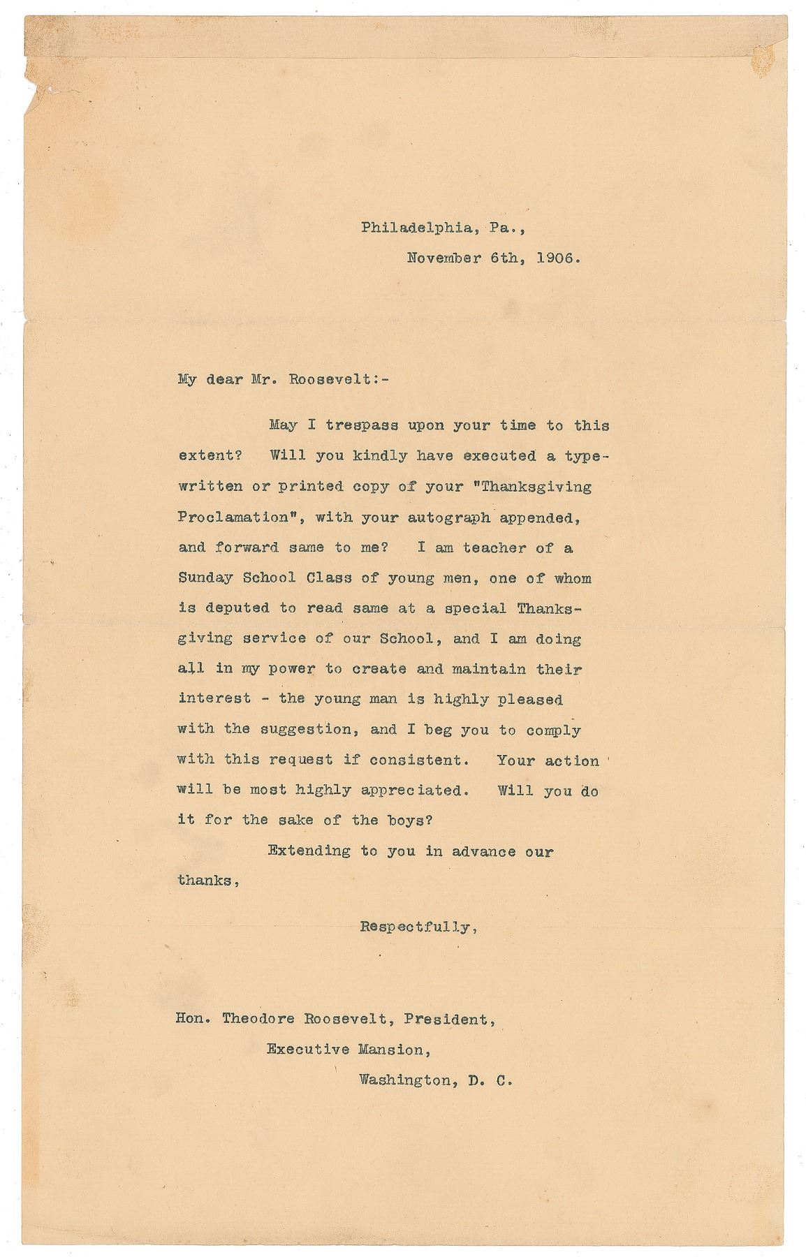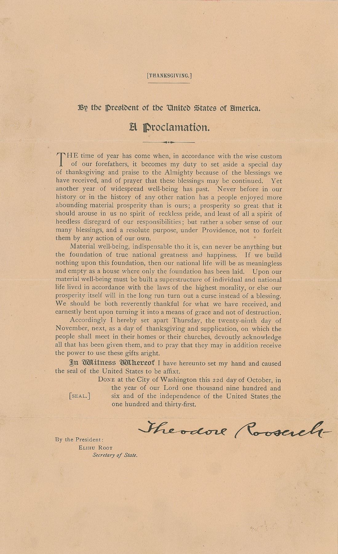 Uncommon DS as president, one page, 8 x 13, October 22, 1906. Official printed Thanksgiving proclamation issued by President Roosevelt, boldly signed at the conclusion in ink. In part: "The time of year has come when, in accordance with the wise custom of our forefathers, it becomes my duty to set aside a special day of thanksgiving and praise to the Almighty because of the blessings we have received, and of prayer that these blessings may be continued. Yet another year of widespread well-being has passed. Never before in our history or in the history of any other nation has a people enjoyed more abounding material prosperity than is ours; a prosperity so general that it should rouse in us no spirit of reckless pride, and least of all a spirit of heedless disregard of our responsibilities; but rather a sober sense of our many blessings, and a resolute purpose under Providence, not to forfeit them by any action of our own…Accordingly, I hereby set apart Thursday, the 29th day of November next, as a day of thanksgiving and supplication, on which the people shall meet in their homes or their churches, devoutly to acknowledge all that has been given them, and to pray that they may in addition receive the power to use these gifts aright." In fine condition, with a hint of light soiling. Accompanied by a copy of the letter sent to Roosevelt requesting that he sign the Thanksgiving proclamation, written by a Sunday school teacher on November 6, 1906.
