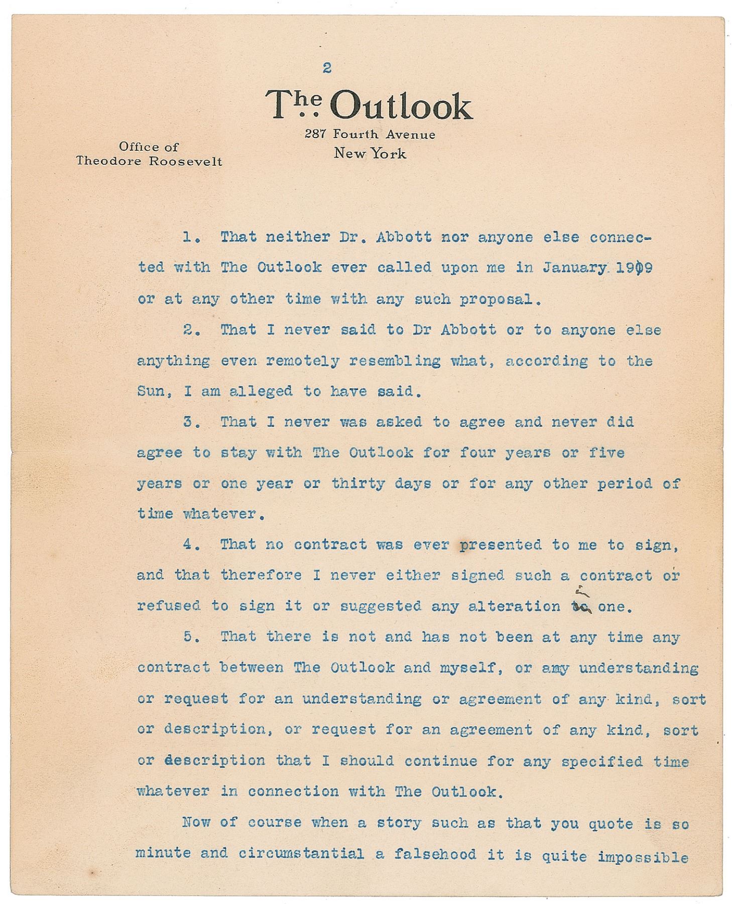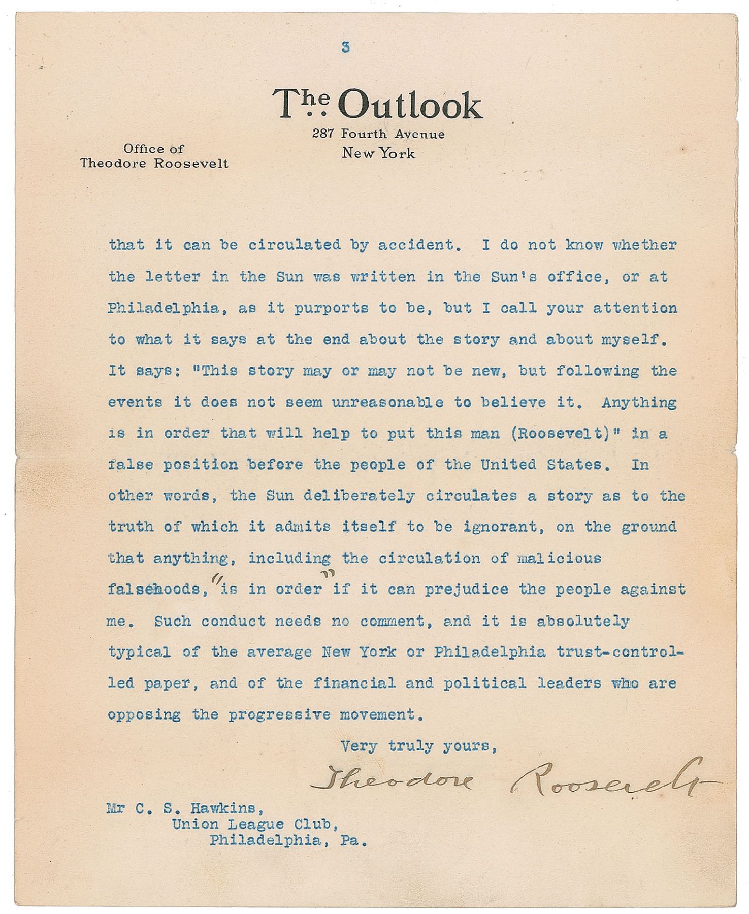 Excellent TLS, three pages, 7.75 x 9.5, The Outlook letterhead, July 30, 1912. Letter to C. S. Hawkins of the Union League Club, in part: "The story in the ‘Sun’ is of course a willful and deliberate falsehood. I never had any conversation of the kind mentioned with Dr. Abbott, or with any other human being, and I never held with anyone any conversation even remotely resembling it. Moreover, Mr. Abbott never presented any contract to me of any kind, and I never signed any contract or considered any contract, and I never have had and have not now any contract with The Outlook. I now have what I always have had with Dr. Abbott and The Outlook people, an understanding that as long as they wish to have me, and as long as I wish to remain, I will continue as associate editor, but that they can rid of me at any time, and I can leave at any time.” Roosevelt proceeds to make a list of five facts refuting the Sun story before concluding with: “I do not know whether the letter in the Sun was written in the Sun’s office, or at Philadelphia, as it purports to be, but I call your attention to what it says at the end about the story and about myself. It says: ‘This story may or may not be new, but following the events it does not seem unreasonable to believe it. Anything is in order that will help put this man (Roosevelt)’ in a false position before the people of the United States. In other words, the Sun deliberately circulates a story as to the truth of which it admits itself to be ignorant, on the ground that anything, including the circulation of malicious falsehoods, ‘is in order’ if it can prejudice the people against me. Such conduct needs no comment, and it is absolutely typical of the average New York or Philadelphia trust-control-led paper, and of the financial and political leaders who are opposing the progressive movement.” Roosevelt makes a few corrections to the text in his own hand. In very good to fine condition, with light blocks of toning to the first page.