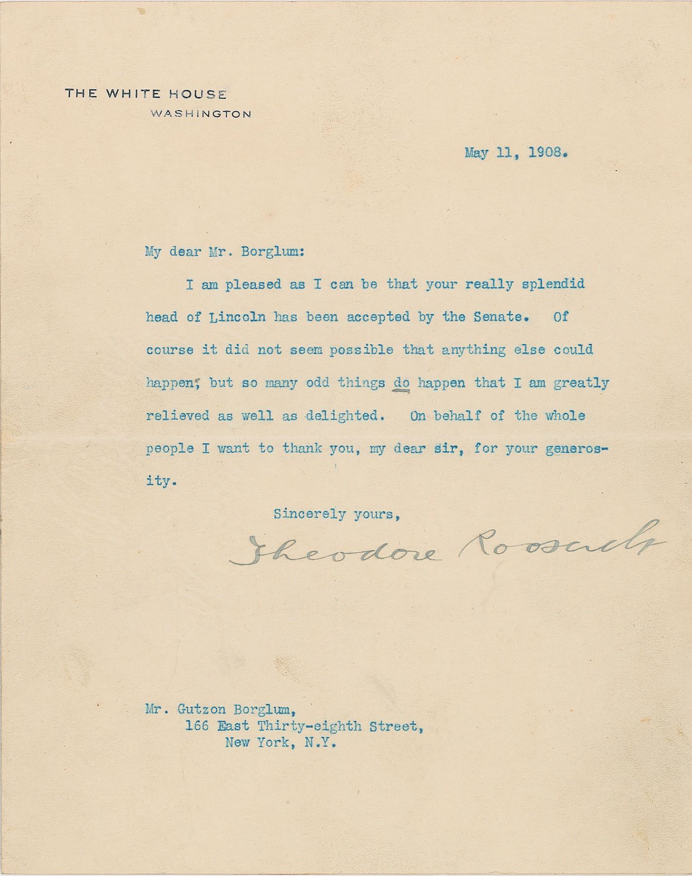 TLS as president, one page, 7 x 8.75, White House letterhead, May 11, 1908. Letter to sculptor Gutzon Borglum, who went on to design Mount Rushmore. In full: "I am pleased as I can be that your really splendid head of Lincoln has been accepted by the Senate. Of course it did not seem possible that anything else could happen; but so many off things do happen that I am greatly relieved as well as delighted. On behalf of the whole people I want to thank you, my dear sir, for your generosity." In fine condition, with some minor soiling. Borglum carved a monumental marble bust of Lincoln in 1908, and it was donated to the Congress by Eugene Meyer, Jr. and accepted by the Joint Committee on the Library in the same year. The bust was displayed in the Capitol Rotunda for many years, before being moved to the crypt in 1979.