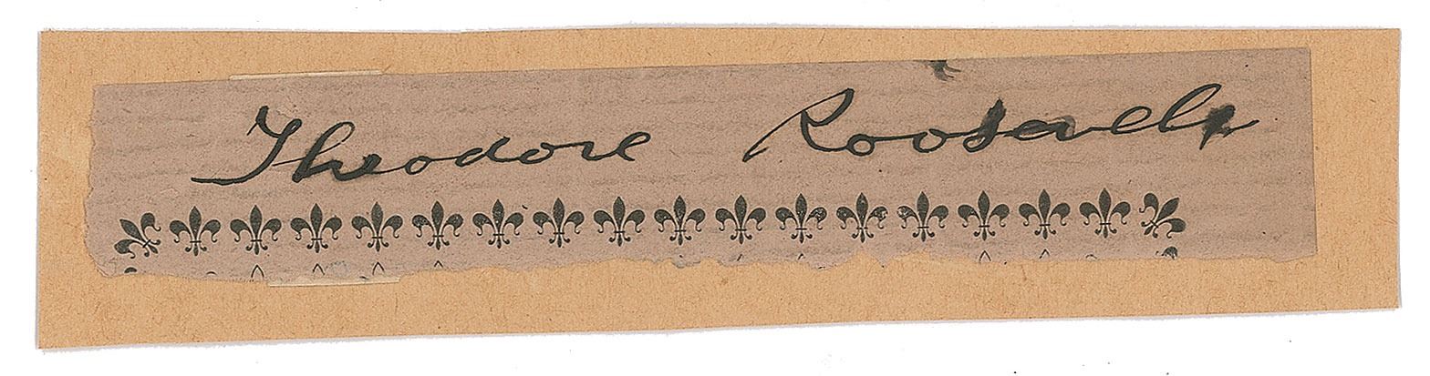 Bold ink signature, "Theodore Roosevelt,” on an off-white 5 x .75 slip affixed to a slightly larger card. In fine condition.