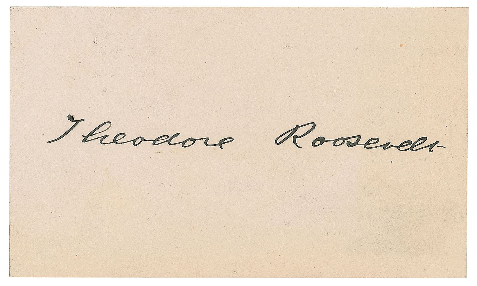 Bold fountain pen signature, "Theodore Roosevelt,” on an off-white 4 x 2.25 card. In fine condition, with some old mounting residue on the back.